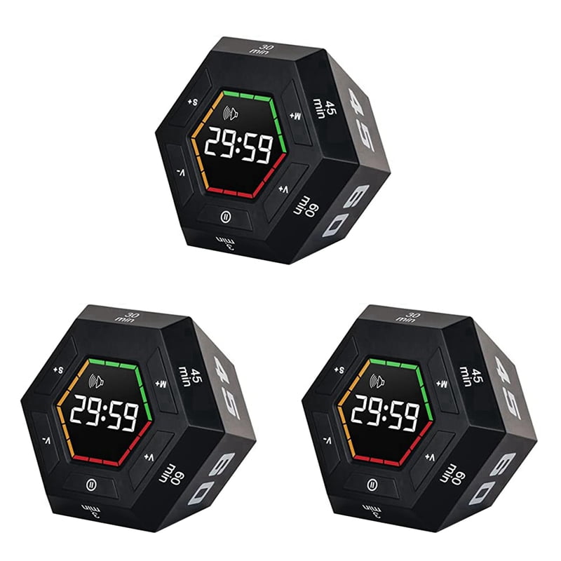 7 voreingestellte Zeiten: 1, 3, 5, 15, 30, 60 und 90 Minuten - perfekt für die Pomodoro-Technik, Kochen, Sport oder Lernsession. Der LED-Bildschirm zeigt die verbleibende Zeit an, und der rote Fortschrittsbalken wird mit der Zeit immer kleiner.