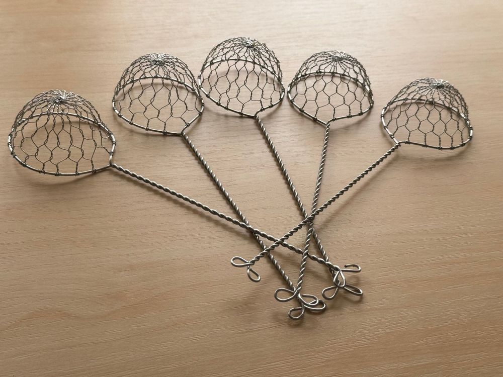 Perfekt für gemütliche Fondue-Abende! Dieses Set mit 10 goldenen Sieben ist ideal für Fleischfondue, Feuertopf oder Mongolentopf. Jedes Sieb ca. 22 cm lang mit 6 cm Durchmesser - praktische Größe. Die geflochtene Konstruktion hält gut und sieht schick aus. Einfach das Fleuch oder Gemüse ins Sieb geben und ins heiße Öl oder Brühe tauchen. Macht jeden Fondue-Abend zum Erlebnis - und jeder Gast hat sein eigenes Sieb. Einfach reinigen und immer wieder verwendbar. Traditionell aber praktisch!