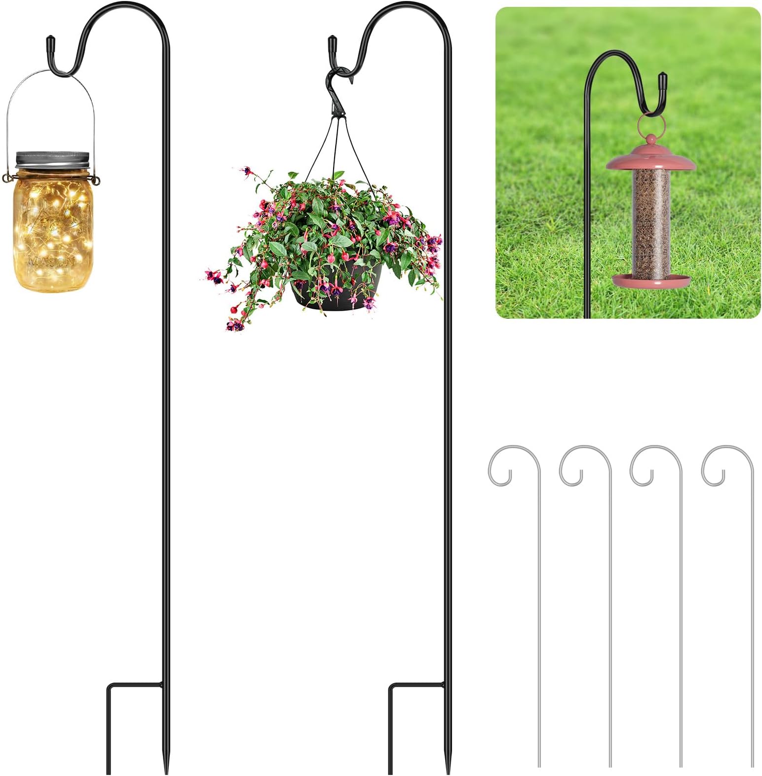 Also, diese Forbabe Schäferhaken sind ja mal richtig vielseitig für deinen Garten! Du bekommst 4 Stück in schwarzem Schmiedeeisen, die sich von 40 cm bis 100 cm höhenverstellen lassen. Jeder Haken besteht aus 5 Teilen à 20 cm - super flexibel für verschiedene Dekorationen.\n\nWas ich besonders clever finde: Die Doppelzinken-Basis graben sich 9 cm tief in den Boden und sorgen für bombenfeste Stabilität. Da wackelt nichts, auch nicht bei Wind! Dazu kommen noch 4 silberne Pflanzenschilder, wo du die Namen deiner Pflanzen draufschreiben kannst.\n\nEinsatzmöglichkeiten gibt's unendlich viele: Hänge Vogelkäfige auf, Windspiele, Blumenampeln, Laternen für die Abendstimmung - deiner Fantasie sind keine Grenzen gesetzt. Die Oberfläche ist eingebrannt und rostet nicht, also halten die Teile ewig.\n\nMontage ist ein Kinderspiel: Einfach zusammenschrauben und in den Boden stecken. Aber Vorsicht: Nicht zu viel Druck ausüben und nichts Schwereres als 2 kg aufhängen. So verwandelst du deinen Garten im Handumdrehen in eine gemütliche Wohlfühloase!
