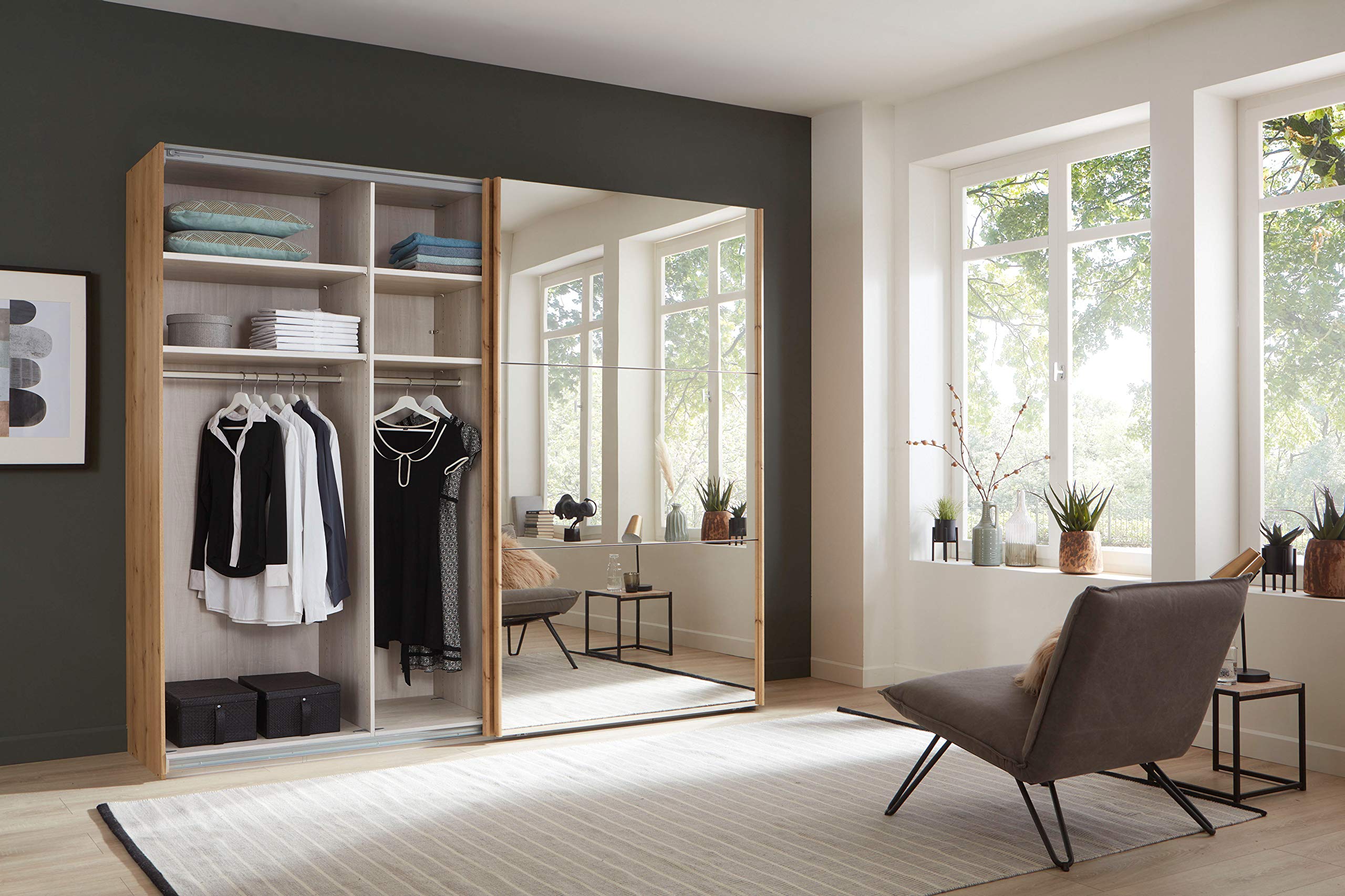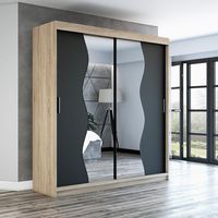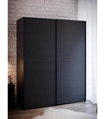 Boah, dieser Kleiderschrank ist ja mal richtig praktisch! 200cm breit, 190cm hoch - da passt alles rein was du hast. 4 Schwebetüren sehen super modern aus, in schwarz matt. Aus stabilem Holzwerkstoff, pflegeleicht und langlebig. Innen Kleiderstangen und Einlegeböden - perfekt organisiert. Passt in jedes Schlafzimmer, stylisch und funktional. In Europa gefertigt, gute Qualität. Einfach aufstellen und sich über den riesigen Stauraum freuen! Damit wird Aufräumen zum Kinderspiel.
