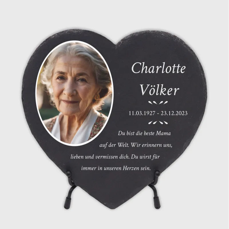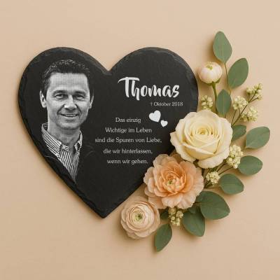 Bewahre die Erinnerung an geliebte Menschen in würdevoller Weise! Diese personalisierte Grabstein-Fototafel aus hochwertigem Porzellan schafft ein bleibendes Andenken von museumswürdiger Qualität.