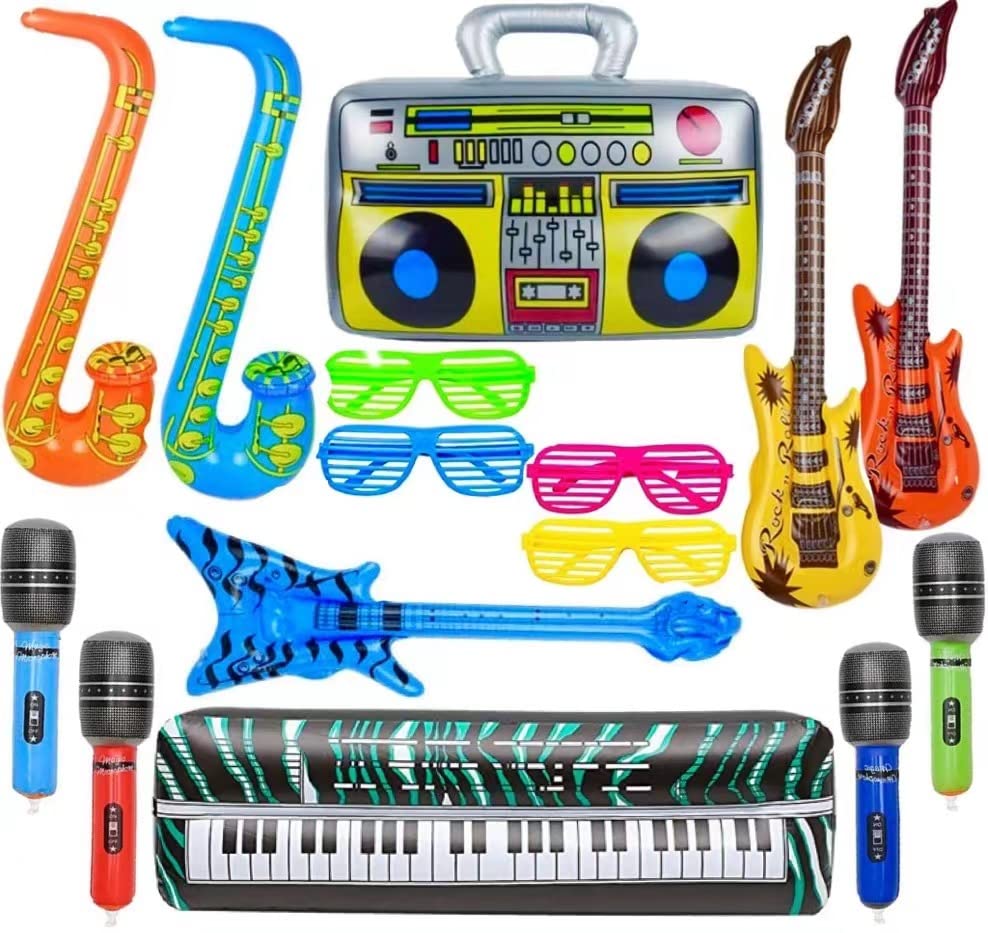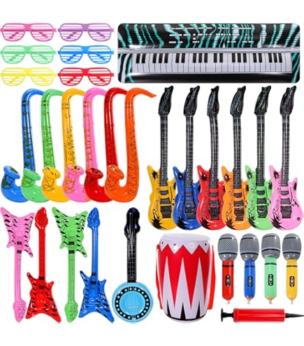 Na, ready für die nächste Party? Mit diesem mega-coolen 7-teiligen Fotobox Set wird jede Feier zum Hit! Stell dir vor: Eine 95 cm große aufblasbare Gitarre, ein Saxophon von 70 cm und ein Mikrofon mit 35 cm - damit kannst du dich als Rockstar fühlen. Dazu kommen noch vier coole Sonnenbrillen in zufälligen Farben, die jedem Outfit den letzten Schliff verpassen. Aus stabilem PVC-Material, bläst sich super schnell auf und hält auch mal was aus. Perfekt nicht nur für die Fotobox, sondern auch als Deko oder für spontane Bühnenauftritte. Ob Hochzeit, Geburtstag oder einfach nur so - mit diesen Teilen gibt's garantiert lustige Fotos und jede Menge Lacher. Leicht zu transportieren, nach der Party schnell zusammengefaltet und verstaut. Für Groß und Klein gleichermaßen geeignet. Deine Gäste werden's lieben!