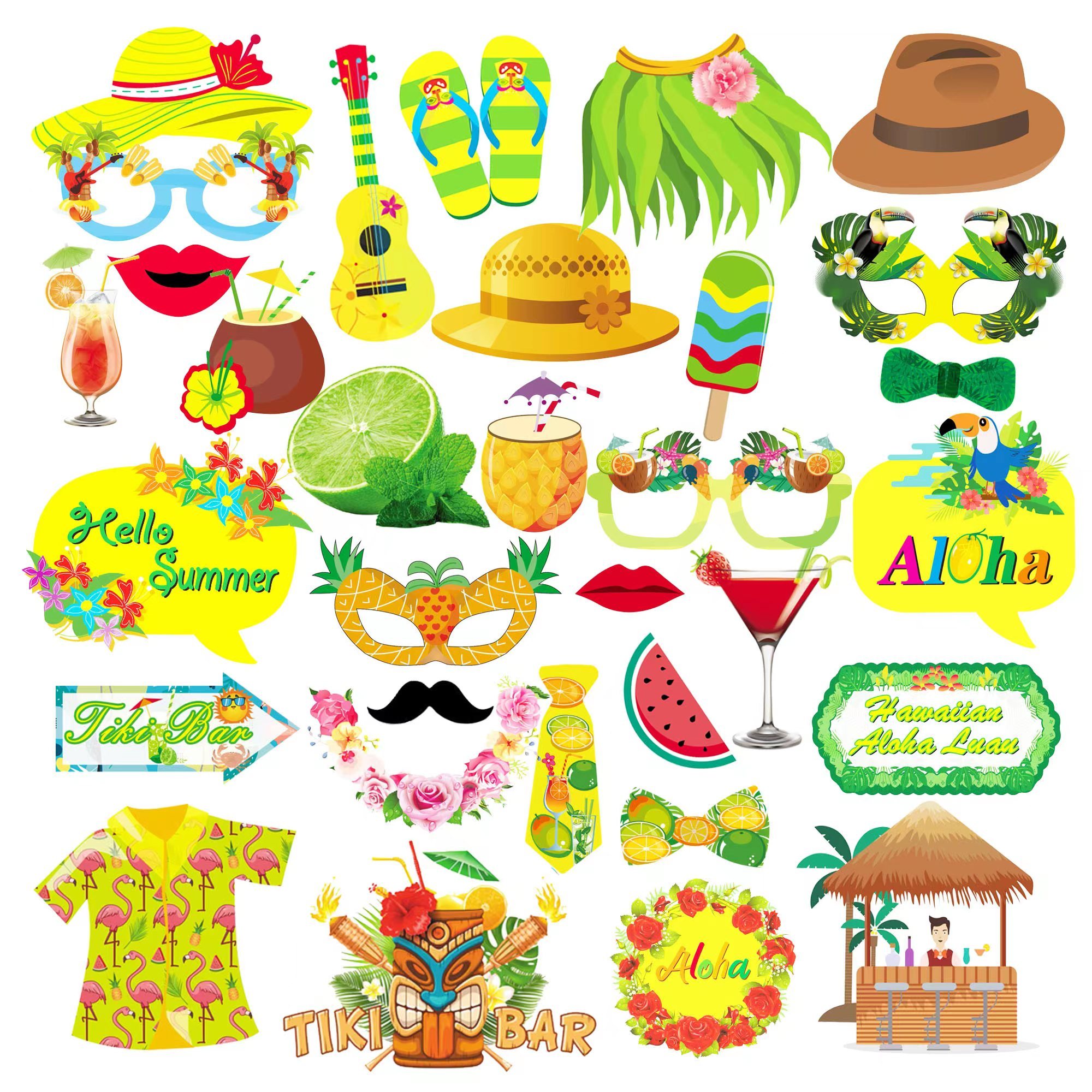 Lustige Fotos garantiert! Dieses 33-teilige Hawaii-Fotobox-Set enthält verrückte Accessoires wie Hüt, Brille, Herz, Krone, Bart und mehr. Aus umweltfreundlichem Karton - robust und sicher. Mit Bambusständern für einfache Montage. Perfekt für Hawaii-Partys, Sommerfeste, Geburtstage oder Strand-Partys. Schafft sofort Party-Stimmung und unvergessliche Fotos. Einfach die Accessoires vor's Gesicht halten und losknipsen. Mach deine Party zum Highlight!