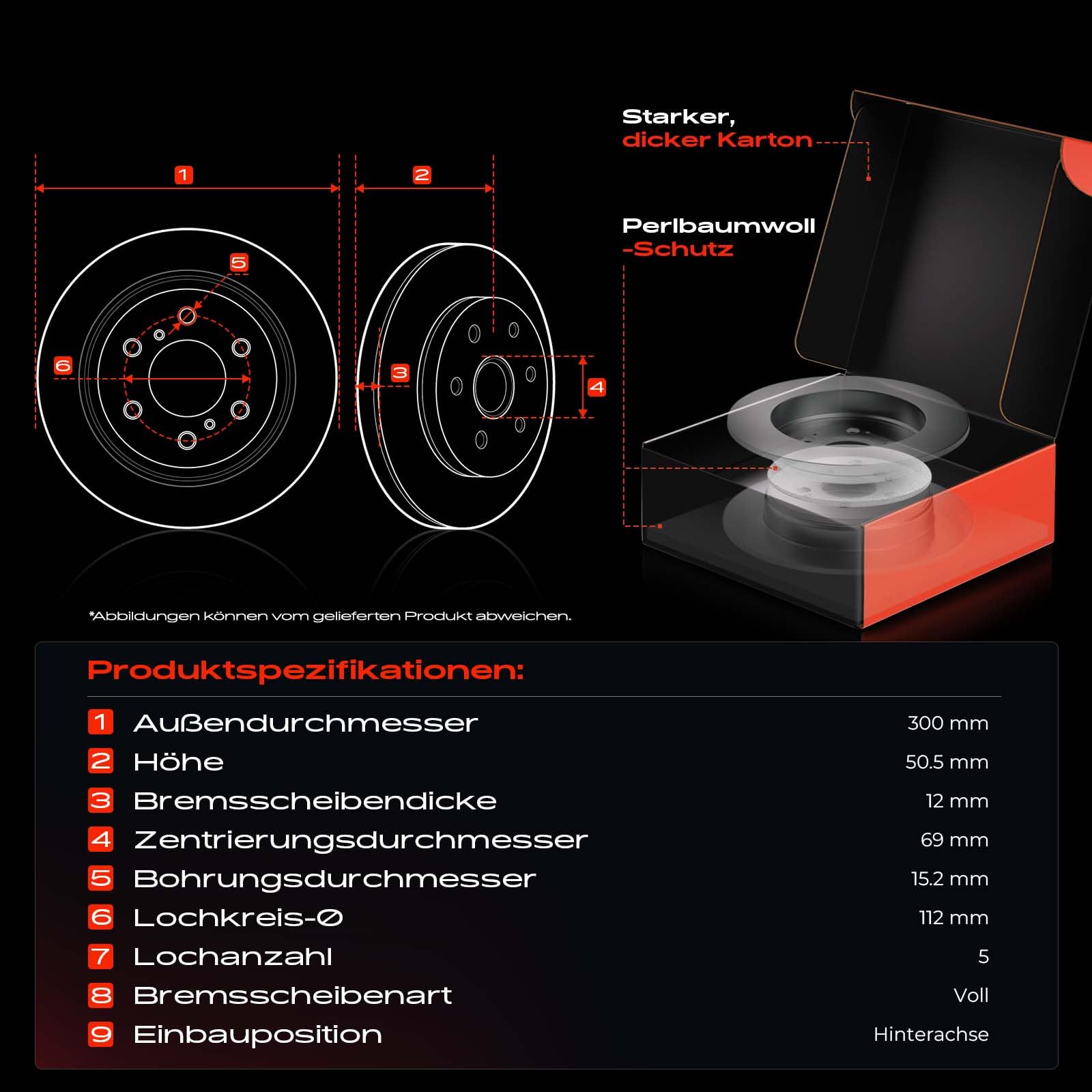 Professioneller Bremsscheibensatz für deine Mercedes C-Klasse! Dieser Komplettsatz für die Hinterachse passt perfekt für W205, C205, S205 und A205 Modelle von 2013-2021 mit 1.6L-2.1L Motoren. Technische Daten: Außendurchmesser 300mm, Dicke 12mm, 5-Loch-Bohrung mit 112mm Lochkreis, Zentrierungsdurchmesser 69mm. Vollbremsscheiben aus hochwertigem Material für optimale Bremsleistung. Ersetzt Originalteile mit den Nummern 0004230512 und A0004230512. Einfache Installation - die Bremsscheiben sind für links und rechts geeignet. Ohne Schrauben im Lieferumfang. Perfekt für alle, die ihre Bremsanlage erneuern oder upgraden wollen. Mit diesen Bremsscheiben bist du sicher unterwegs und hast die volle Kontrolle über dein Fahrzeug. Qualität, die überzeugt!