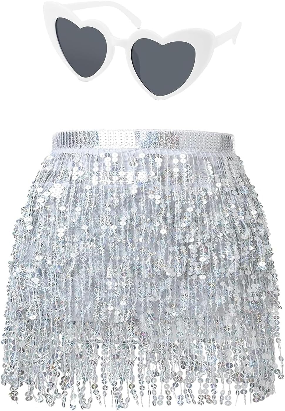 Bereit für den großen Auftritt! Dieser atemberaubende Paillettenrock mit funkelnden Fransen macht dich zum absoluten Star auf jeder Party. Die holografischen Pailletten reflektieren das Licht in allen Regenbogenfarben und sorgen für einen magischen Glitzereffekt. Der verstellbare Bund passt sich jeder Figur an und rutscht nicht - eine Größe für alle! Unter den Pailletten befindet sich ein weiches, blickdichtes Futter in derselben Farbe. Im Set inklusive: eine niedliche Herz-Sonnenbrille für den perfekten Look. Perfekt für Clubs, Festivals, Geburtstagsfeiern, Karneval, Halloween oder Bauchtanz-Auftritte. Die zarten Fransen schwingen bei jeder Bewegung elegant mit und verleihen dir eine unwiderstehliche Ausstrahlung. Einfach überziehen, den Bund anpassen und bereit sein, alle Blicke auf sich zu ziehen! Der Rock ist ca. 220cm lang, das Dekorteil misst etwa 78cm - genug Stoff für dramatische Bewegungen.