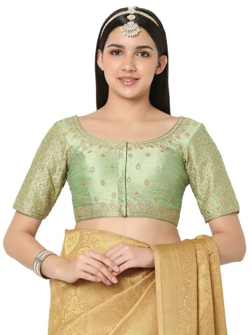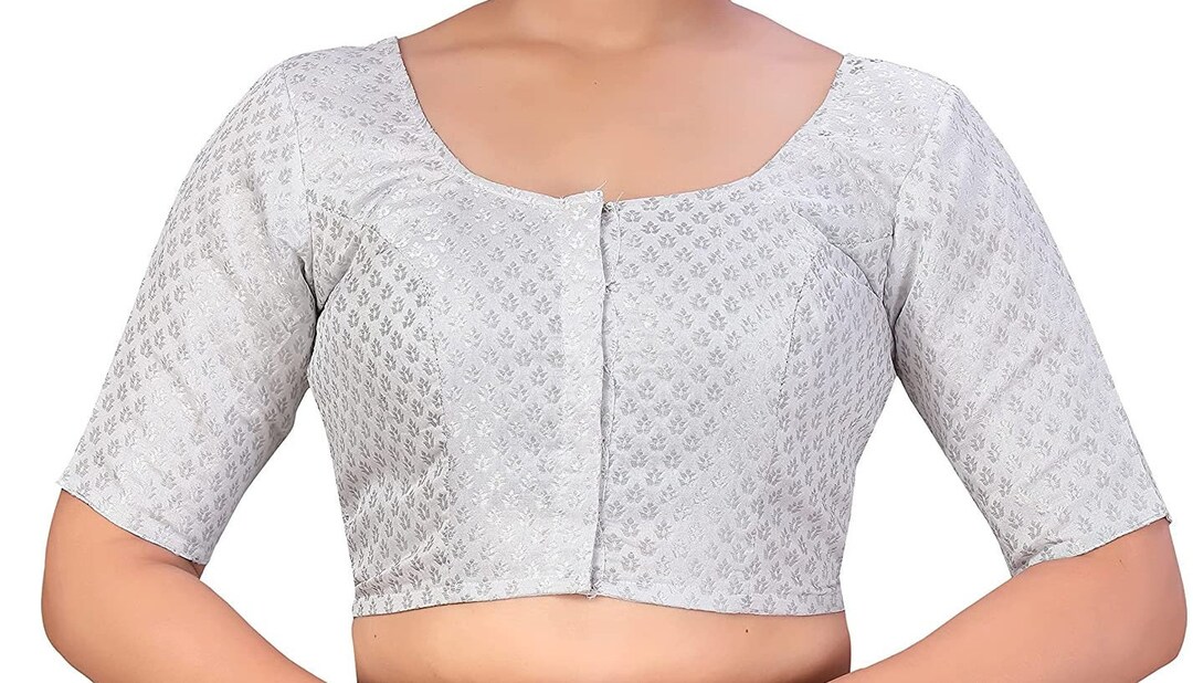 Oh, diese Brokat-Bluse ist ja wunderschön! Für deinen Saree ist sie einfach perfekt - komplett fertig genäht und sofort tragebereit! Der Brokat-Stoff mit dem goldenen Zari-Muster sieht einfach royal aus!\\n\\nDer U-Boot-Ausschnitt ist total elegant und die ellbogenlangen Ärmel sitzen wie angegossen. Hinten schließt die Bluse mit Haken und Öse - super praktisch und sicher! Das Innenfutter aus reiner Baumwolle sorgt für maximalen Komfort auf der Haut.\\n\\nDie Bluse ist nicht gepolstert, aber durch das Futter trotzdem angenehm zu tragen. An den Rändern ist sogar Platz für Änderungen, falls mal was angepasst werden muss - wie praktisch ist das denn!\\n\\nFarben gibt's in allen Varianten: Von dezentem Schwarz über knalliges Rot bis zu elegantem Gold - da ist für jeden Geschmack was dabei! Die Größen von 32 bis 44 passen den meisten Frauen. Einfach deine normale Größe nehmen!\\n\\nPerfekt für Hochzeiten, Feste oder andere besondere Anlässe! Die Bluse ist nur zur chemischen Reinigung - aber das ist bei so einem schicken Teil ja auch verständlich! Sieht einfach zu schick aus für die Waschmaschine! Dein Saree wird damit zum absoluten Hingucker!
