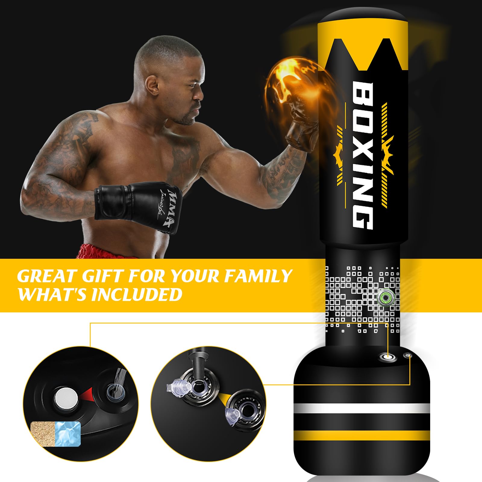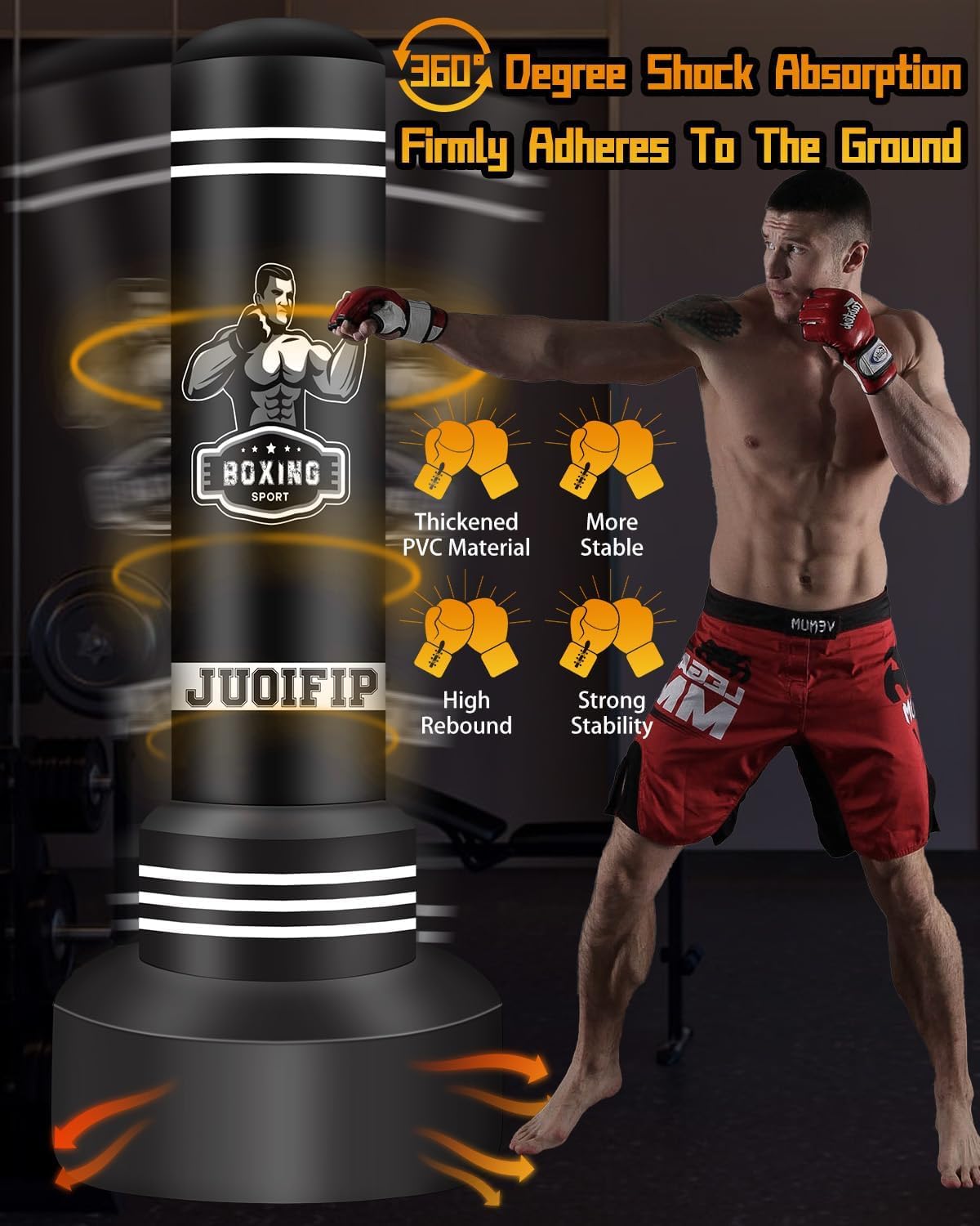 Wow, was für ein komplettes Box-Set! Dieser 180cm hohe Boxsack-Ständer kommt mit allem, was du für dein Training brauchst - inklusive Boxhandschuhen! Das geniale Feature: Eine eingebaute elektrische Pumpe, die du einfach per Knopfdruck startest. Kein lästiges Hantieren mit separaten Pumpen mehr! Der Sack ist aus extra dickem 0,5mm PVC-Material und hält bis zu 80kg aus. Die Basis kannst du mit bis zu 180lb Wasser oder 200lb Sand füllen - so steht der Sack bombenfest. Das 360°-Drehgelenk sorgt für realistisches Zurückfedern nach jedem Schlag, genau wie beim echten Training. Perfekt für Boxen, MMA, Muay Thai, Karate oder einfach zum Stressabbau. Das Set ist super für Anfänger geeignet - einfach aufblasen, Basis befüllen und loslegen! Mit der USB-Ladefunktion kannst du die Pumpe immer wieder aufladen. Und falls mal was sein sollte: Es gibt eine 3-monatige Qualitätsgarantie. Egal ob für zu Hause, Garage oder Garten - damit machst du jedes Training zum Erlebnis! Hol dir dein persönliches Fitness-Studio für Kampfsport und Ausdauertraining - deine Hände sind durch die mitgelieferten Handschuhe optimal geschützt.