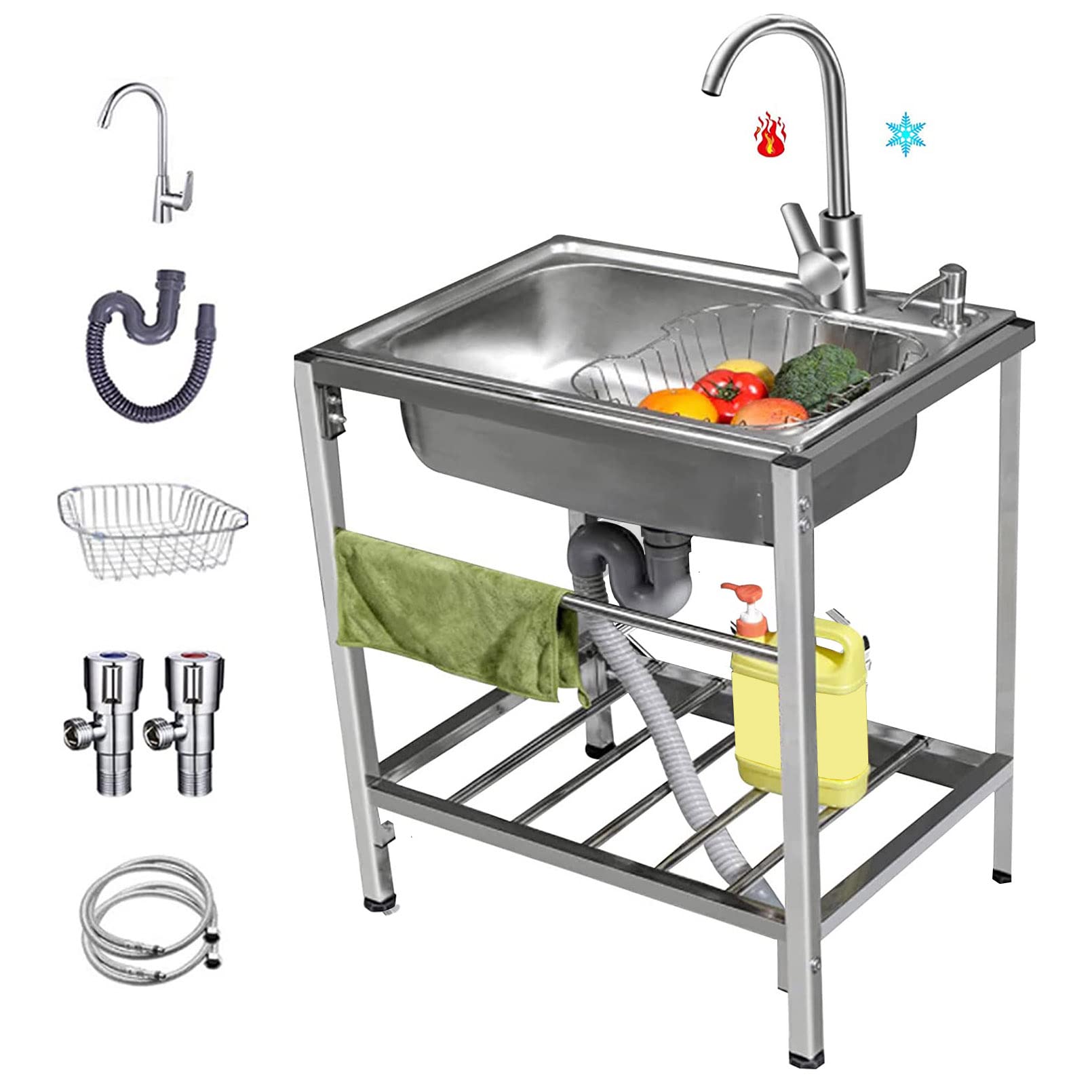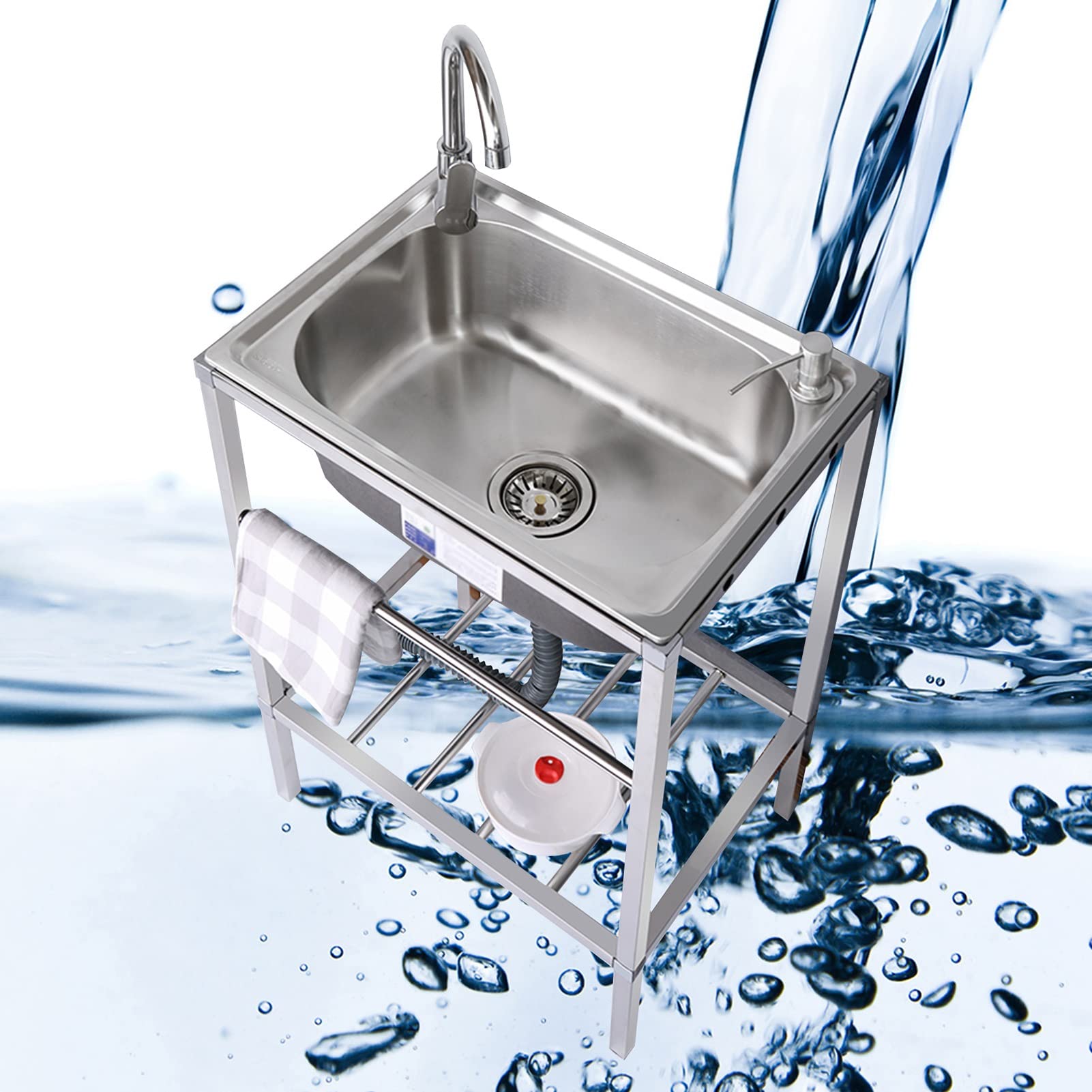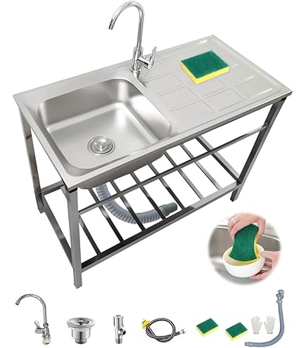 Richtig praktisch dieses Edelstahl-Spülbecken! Ob in der Garage, im Garten, im Waschkeller oder sogar im Gewerbe - diese Spüle aus 304er Edelstahl kann echt alles. Mit den Maßen 50x50x80 cm oder 60x60x80 cm hast du genug Platz zum Arbeiten. Die 23 cm tiefe Wanne fasst volle 10,5 Gallonen - da passt ne Menge Geschirr, Werkzeug oder Wäsche rein. Der 15 cm hohe Spritzschutz verhindert, dass deine Wände dreckig werden. Das coole: Die Füße sind höhenverstellbar, sodass die Spüle auch auf unebenen Böden stabil steht. Montage ist total einfach - Wasserhahn, Abfluss und Füße anbringen, schon kann's losgehen. Auch wenn mal kleine Kratzer drin sind - das ist bei gewerblichen Spülen normal und stört nicht. Perfekt für alle, die draußen oder im Keller eine robuste Spülmöglichkeit brauchen. Ein Arbeitstier das lange hält!