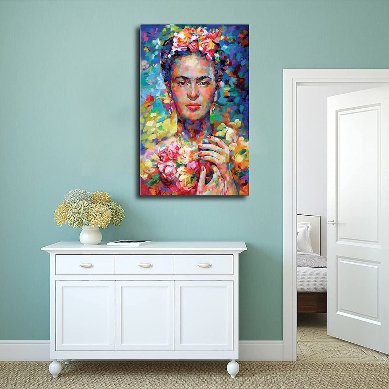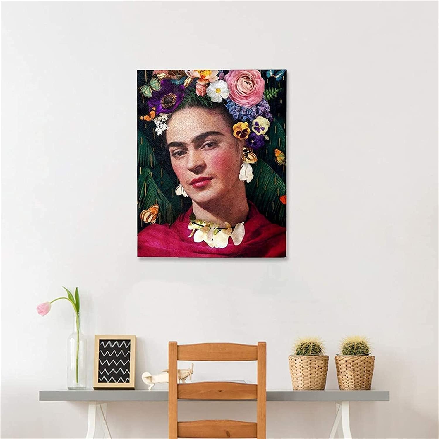 Bring mexikanische Kunst in dein Zuhause! Dieses wunderschöne Frida Kahlo Bild auf Leinwand verleiht jedem Raum sofort mehr Charakter. \\n\\n🎨 Größe: 50 x 70 cm - perfekt für leere Wände \\n🎨 HD-Druck - gestochen scharfe Details \\n🎨 Wasserdichte Tinte - verblasst nicht \\n🎨 Ohne Rahmen - du kannst selbst einen wählen \\n🎨 Vielseitig einsetzbar - Wohnzimmer, Küche, Büro \\n\\nDas Selbstporträt der berühmten Künstlerin ist ein echter Hingucker und sorgt garantiert für Gesprächsstoff. Die Farben sind intensiv und lebendig gedruckt. \\n\\nEinfach an die Wand hängen - ob mit Reißnägeln, Klebeband oder in einem schicken Rahmen. Perfekte Deko für alle die moderne Kunst lieben und ihrem Zuhause eine persönliche Note verleihen wollen!