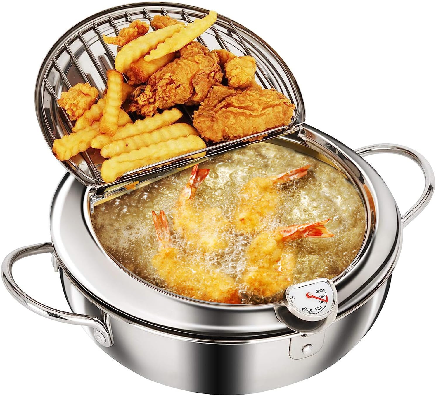 Kross frittieren wie in Japan! Dieser 3,4L Fritteusentopf aus 304 Edelstahl ist perfekt für Tempura, Pommes und mehr. Mit praktischem Thermometer - so siehst du immer die perfekte Öltemperatur für knusprige Ergebnisse. Der Deckel verhindert lästiges Spritzen und das Abtropfgitter lässt überschüssiges Öl abtropfen. Super für Gas-, Induktions- und Elektroherde geeignet. Mit 24,8cm Durchmesser und 15cm Höhe ideal für Familien oder kleine Partys. Einfach zu reinigen und absolut rostfrei. Mach deine eigenen frittierten Leckereien zu Hause - gesünder und günstiger als beim Imbiss! Perfekt für Hähnchen, Fisch, Gemüse und natürlich die beliebten japanischen Tempura-Gerichte.