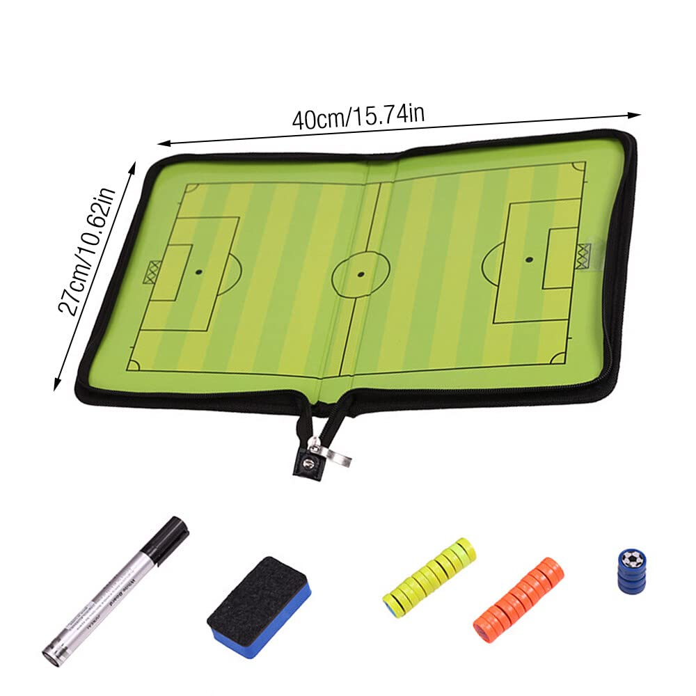 Für alle Fußballtrainer da draußen! Diese klappbare Taktiktafel von Leikurvo ist dein neuer bester Freund beim Training. Aufgeklappt misst sie stolze 42x28 cm - da hast du genug Platz, um deine taktischen Meisterwerke zu zeichnen. Und wenn's vorbei ist, einfach zusammenklappen und mitnehmen. Mit den 26 magnetischen Spielfiguren kannst du Formationen schnell und einfach darstellen. Das Schreiben und Löschen funktioniert super einfach - kein Gefummel mehr! Das komplette Set enthält alles, was du brauchst: Taktiktafel, Timer, Spielfiguren, Radiergummi, Stift und sogar eine Pfeife. Die wasserfeste Oberfläche hält auch mal einen Regenschauer aus, und die Linien verblassen nicht. Perfekt für die Halbzeit-Pep-Talk oder zur Vorbereitung aufs nächste Spiel. Egal ob Jugendtraining oder Herrenmannschaft - mit dieser Tafel erklärst du taktische Feinheiten viel besser. Der Reißverschluss hält alles sicher zusammen, sodass nichts verloren geht. Einfach in die Tasche stecken und zum Training mitnehmen - so praktisch war Taktiktraining noch nie!