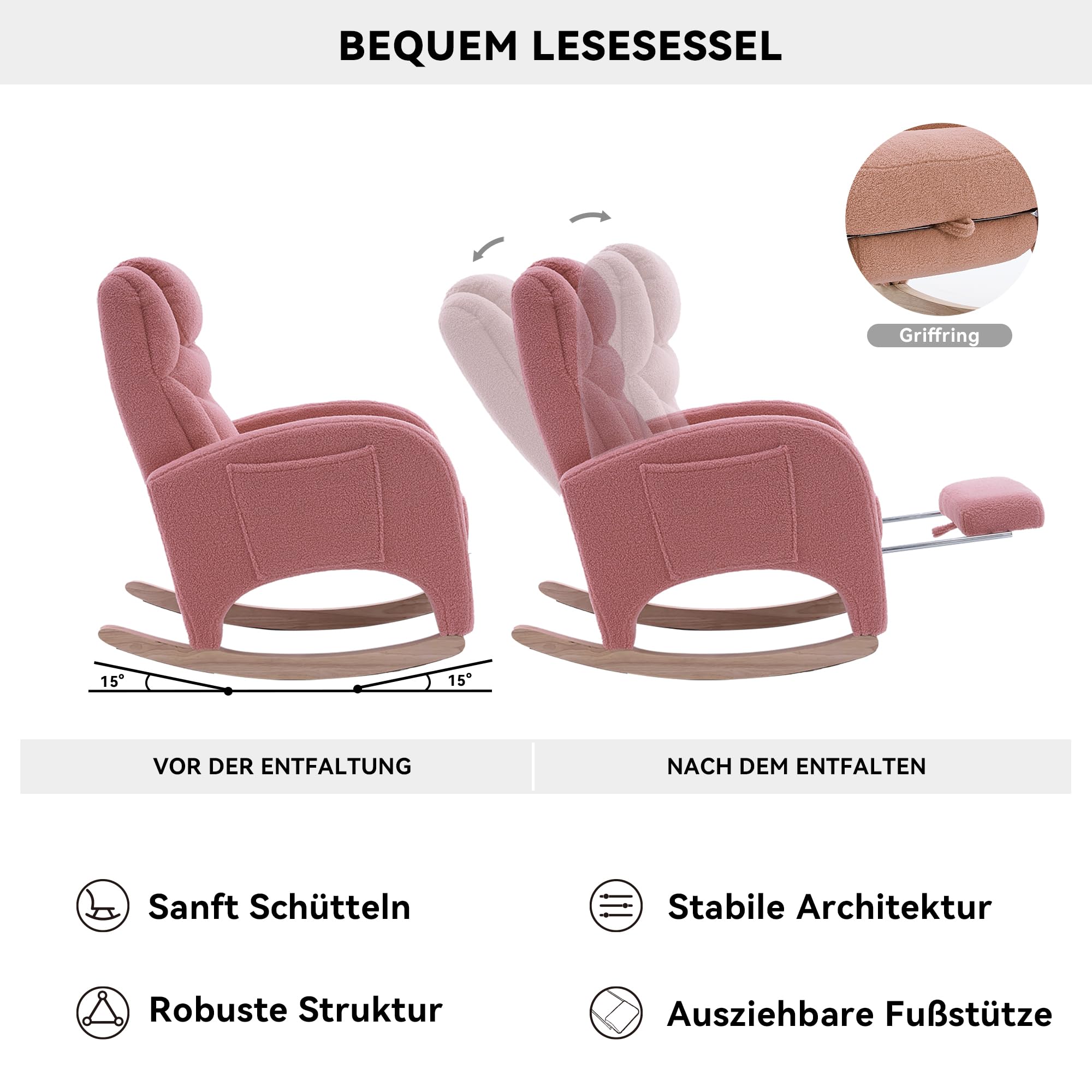 Einfach nur gemütlich! Dieser DEKKETO Schaukelstuhl ist der absolute Traum für entspannte Stunden! Extra breiter und weich gepolsterter Sitz - da sitzt man wie auf Wolken! Mit praktischer Fußstütze - perfekt für totale Entspannung! Große Seitentasche für Bücher, Fernbedienung oder Babyzubehör - alles griffbereit! Hohe Rückenlehne und geschwungene Armlehnen - optimal für Rücken und Lendenbereich! Aus weichem Teddy-Stoff - super kuschelig und pflegeleicht! Perfekt als Stillstuhl, Lesesessel oder einfach zum Relaxen im Wohnzimmer! Sanftes Schaukeln beruhigt und entspannt! In verschiedenen Farben erhältlich - such dir deine Lieblingsfarbe aus! Einfach hinsetzen, zurücklehnen und den Tag genießen!