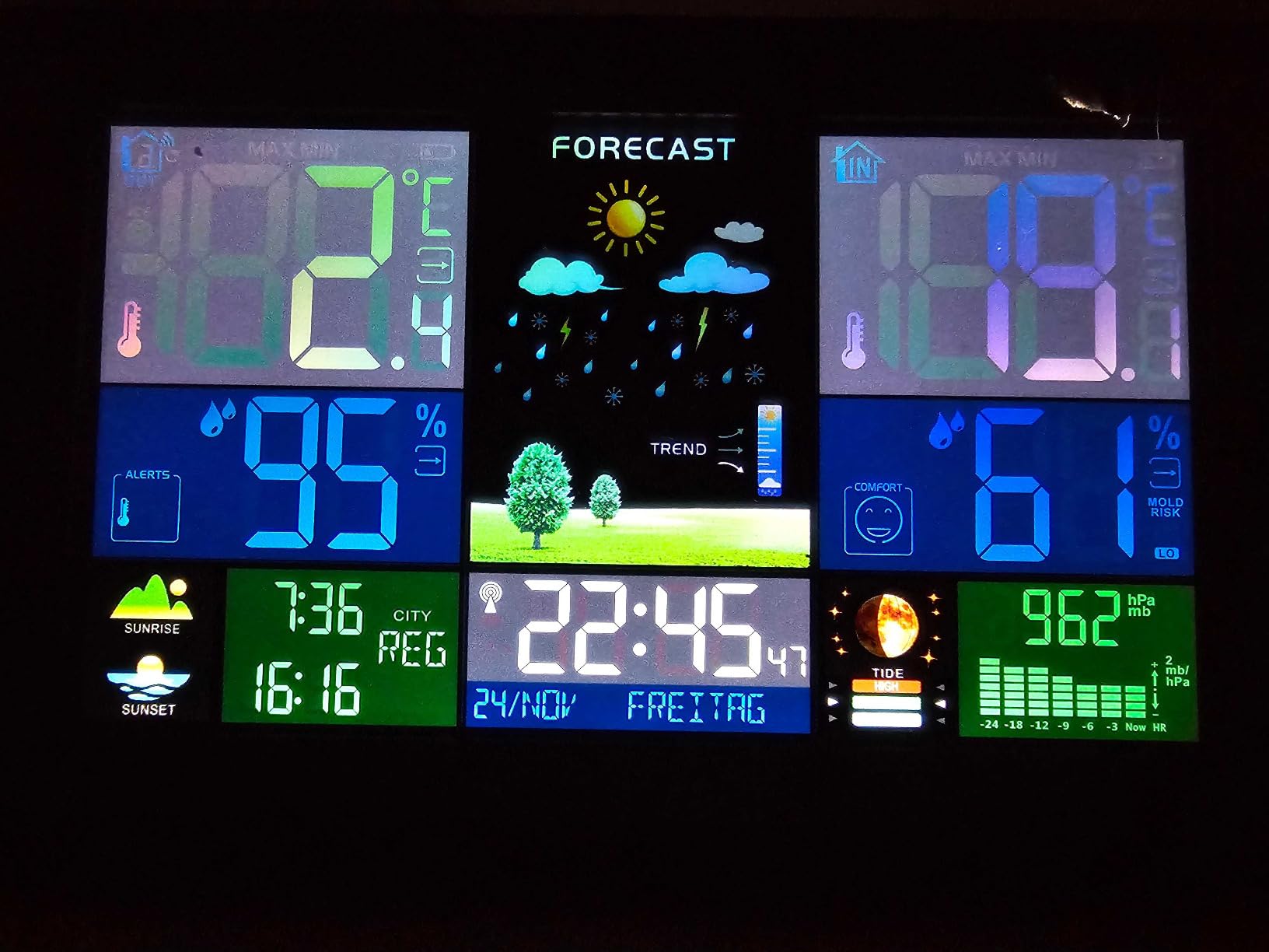 Immer bestens informiert über das Wetter! Diese moderne Funk-Wetterstation mit großem Farbdisplay zeigt dir alle wichtigen Wetterdaten auf einen Blick. Mit dem praktischen Außensensor misst sie präzise Temperatur (-40°C bis +70°C) und Luftfeuchtigkeit (20%-95% RF) draußen - und das völlig drahtlos bis 60 Meter Reichweite! Das Gerät empfängt automatisch die exakte Zeit via DCF-Funksignal und bietet viele praktische Funktionen: 6-Tage-Wettervorhersage, Luftdruck-Anzeige, Mondphasen, Sonnenauf- und untergang, Wecker mit Schlummerfunktion und Komfort-Anzeige. Besonders clever: Die Schimmelrisiko-Warnung und Frostalarme schützen dich vor unangenehmen Überraschungen. Das Display ist in 4 Helligkeitsstufen einstellbar und per Berührung aktivierbar. Per USB oder Batterien betreibbar - flexibel für jeden Standort. Mit dabei: Wetterstation, Außensensor, USB-Kabel und Bedienungsanleitung. So macht Wetterbeobachtung Spaß!