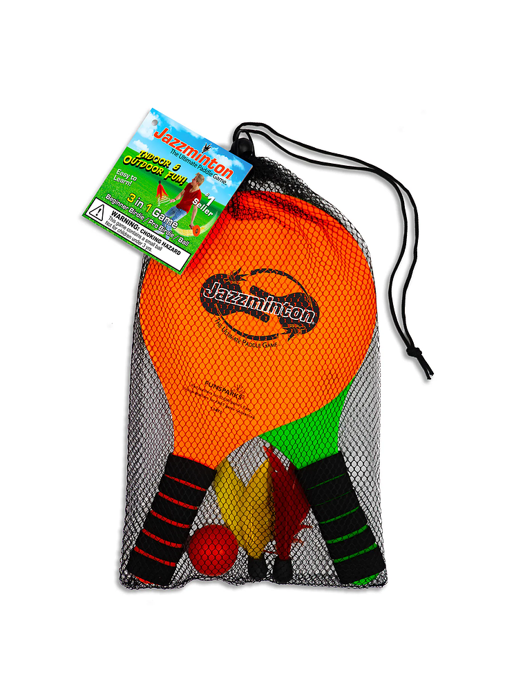 Total vielseitiger Sportspaß für die ganze Familie! Das Funsparks Jazzminton Deluxe Set kombiniert die besten Elemente aus Badminton, Tennis und Squash in einem Spiel. Enthalten sind 2 hochwertige fluoreszierende Holzpaddel mit bequemen Schaumstoffgriffen, 6 verschiedene Birdies für unterschiedliche Spielgeschwindigkeiten und 2 Bälle für windiges Wetter.