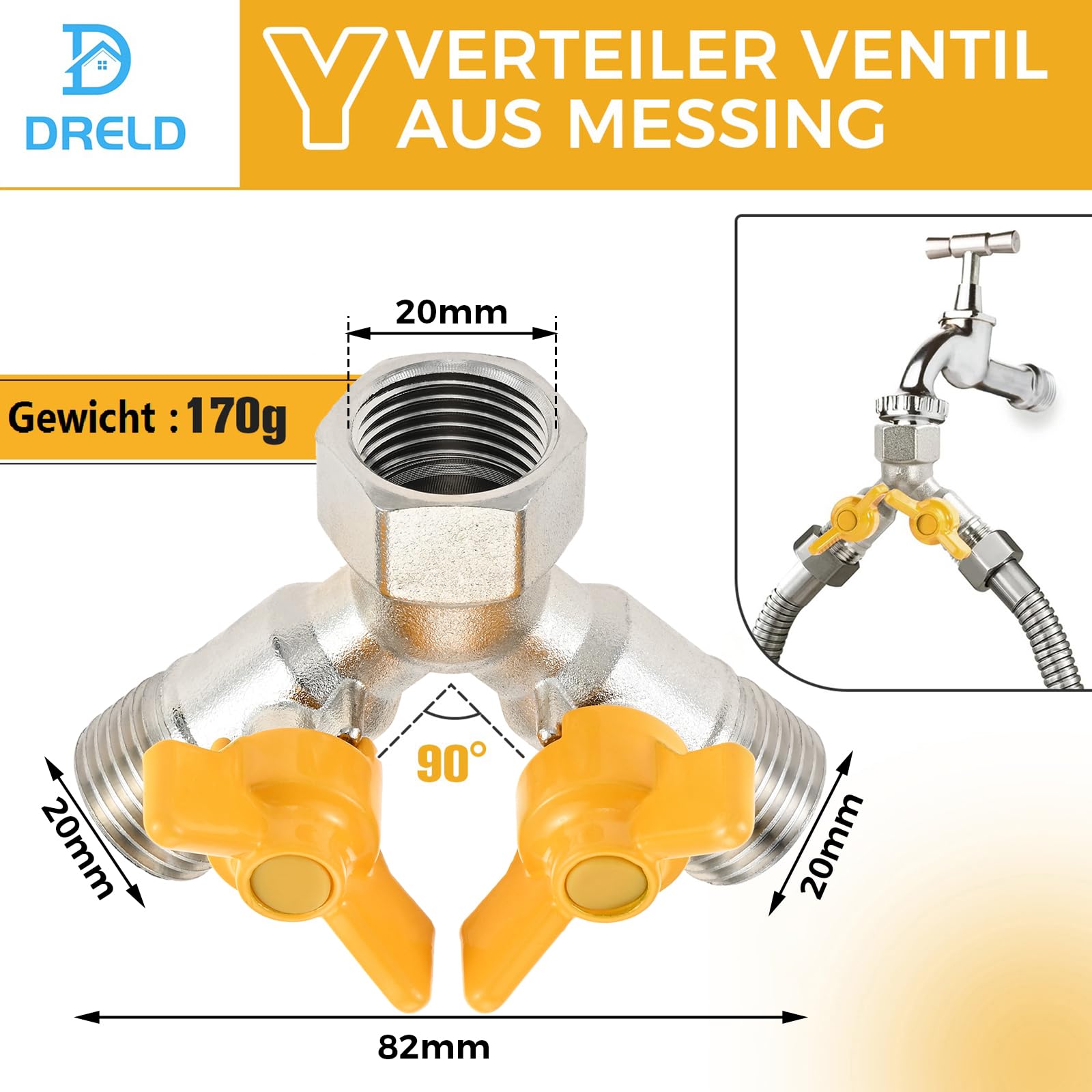 Praktisches Y-Umschaltventil aus Messing für deine Wasseranschlüsse! Mit G 1/2 Zoll Gewinde passt dieses Ventil perfekt für verschiedene Anwendungen. Das beste: Du brauchst kein Werkzeug für die Montage! \\n\\nDas Ventil hat zwei unabhängige Absperrhähne, sodass du die Wasserzufuhr flexibel steuern kannst. Ob für die Waschmaschine, den Gartenschlauch oder die Dusche - hier hast du immer die Kontrolle. \\n\\nTechnische Daten: \\n- Material: Massiv-Messing vernickelt \\n- Gewinde: G 1/2 Zoll (20mm) \\n- Gesamtgröße: 7x8,5cm \\n- Temperaturbereich: 1-95°C \\n- Gewicht: 229g \\n\\nWichtig: Die obere Mutter kann nicht gedreht werden, was die Gefahr von Undichtigkeiten reduziert. Das Y-förmige Design ermöglicht eine flexible Wasserumleitung. \\n\\nSuper einfach zu installieren - einfach anschrauben und schon kannst du zwischen verschiedenen Wasseranschlüssen umschalten. Perfekt für Haushalt, Garten und Werkstatt!