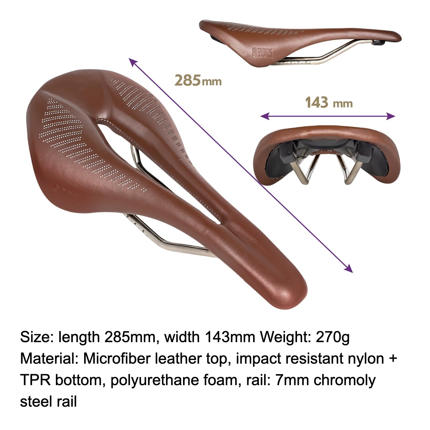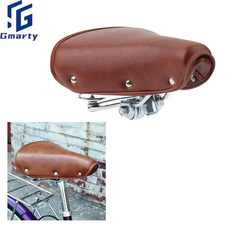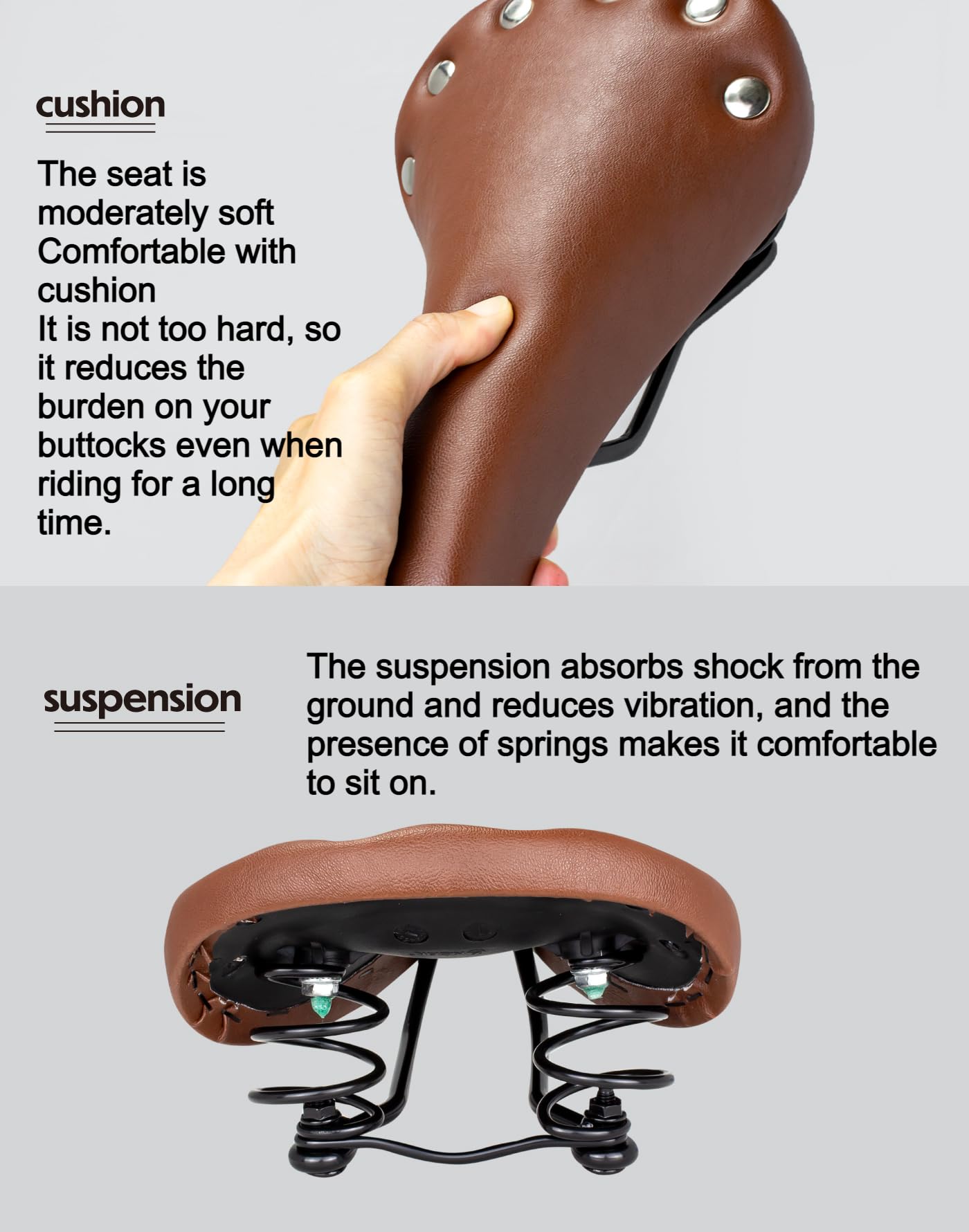 Boah, dieser Fahrradsattel sieht ja mega aus! Mit dem braunen PVC-Leder und den coolen Nieten hat er total diesen Retro-Charme. Aber er ist nicht nur hübsch - die Federung nimmt echt jeden Stoß weg, sodass dein Hintern nicht so schnell wehtut.\n\nMaße: 279 mm lang und 163 mm breit - also perfekt für die meisten Fahrräder. Die Stahlschiene ist super stabil und hält was aus. Und das Beste: Der Sattel ist wasserabweisend! Wenn mal was daneben geht, einfach abwischen und fertig.\n\nOb fürs Rennrad, Mountainbike oder Citybike - dieser Sattel macht überall eine gute Figur. Und mit 510 Gramm ist er auch nicht zu schwer. Einfach den alten Sattel abmontieren, diesen drauf - und schon fährt sich's wie auf Wolken!\n\nPraktisch: \\\Braunes PVC-Leder mit stylischen Nieten\\\ | \\\Integrierte Federung für bessere Stoßdämpfung\\\ | \\\Wasserabweisende Oberfläche für einfache Reinigung\\\ | \\\Stabile Stahlschiene für lange Haltbarkeit\\\ | \\\Maße: 279 x 163 mm, Gewicht: 510 g\\\ | \\\Perfekt für Rennräder, Mountainbikes und Citybikes\\\