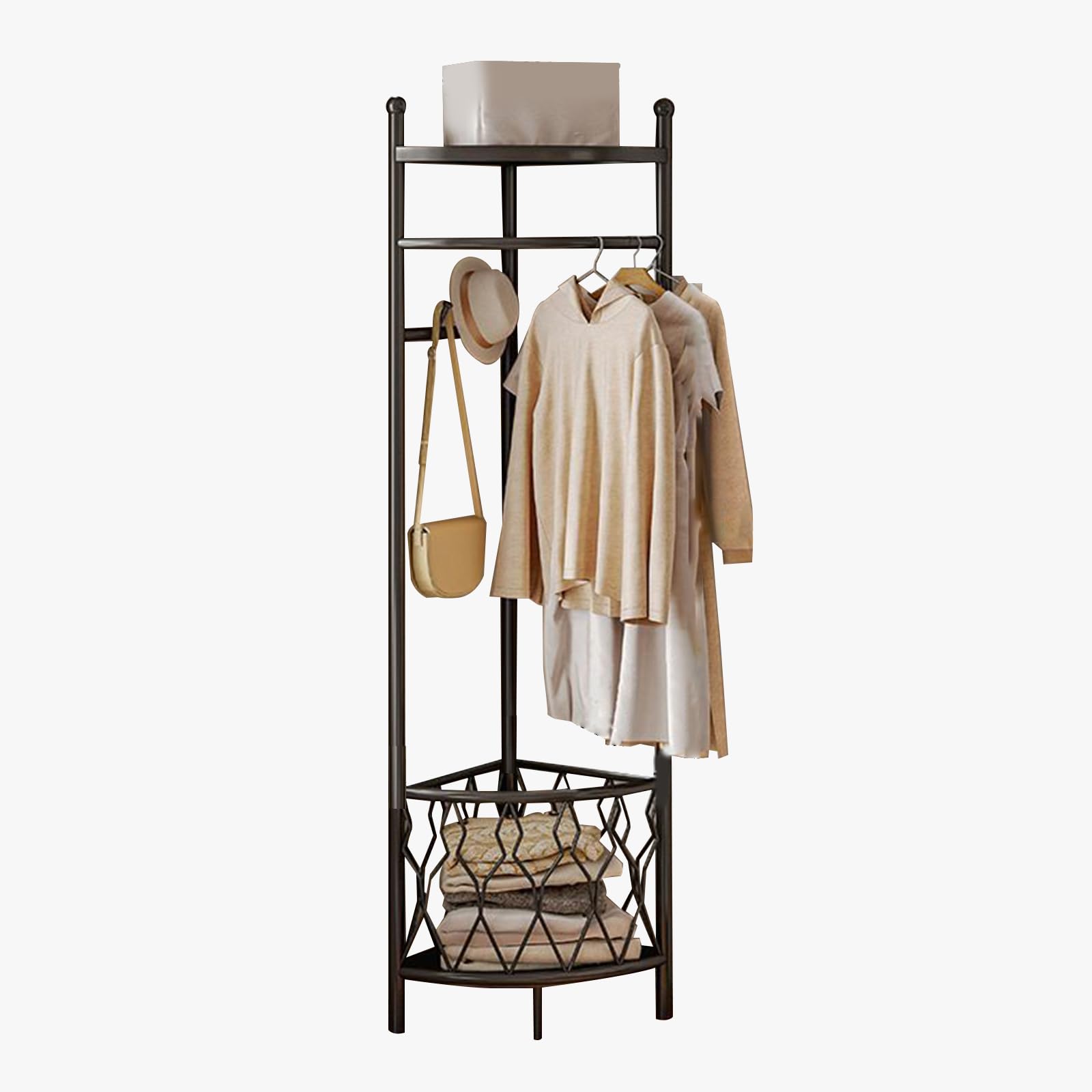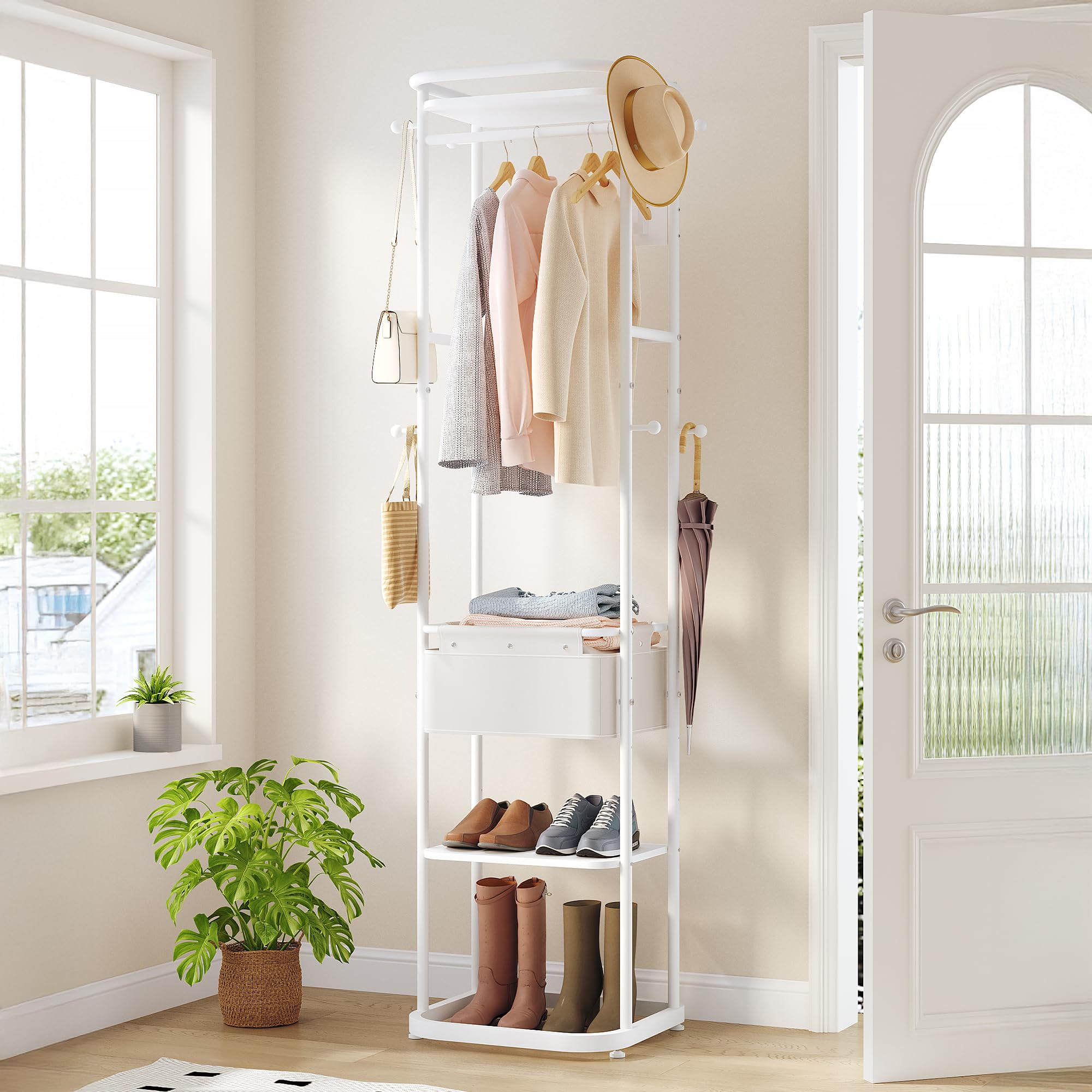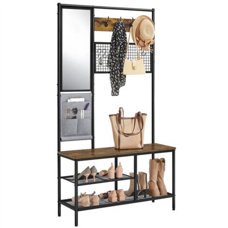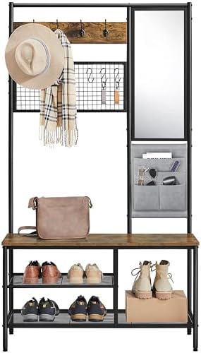 Endlich Ordnung im Flur! Dieser Garderobenständer ist der absolute Alleskönner für kleine Räume. Mit 3 Ablagen, einem großen Stoffkorb und satten 11 Haken hast du Platz für Jacken, Taschen, Schuhe und alles was sonst noch so rumliegt. Maße: 40x44,5x182 cm - passt auch in enge Eingangsbereiche. Der Metallrahmen ist mega stabil, jede Ablage trägt 10 kg, jeder Haken 5 kg. Sieht mit den braunen Holzoptik-Elementen und schwarzem Gestell richtig schick aus - nicht so dieser langweilige Standard. Montage ist total easy, alles ist beschriftet und die Anleitung verständlich. Perfekt für Studentenwohnung, Gästezimmer oder wenn der Flur mal wieder aus allen Nähten platzt. Aus FSC-zertifiziertem Holz - also auch noch umweltfreundlich! Einfach aufbauen und sofort nutzen - nie wieder Kleiderberge auf dem Stuhl!