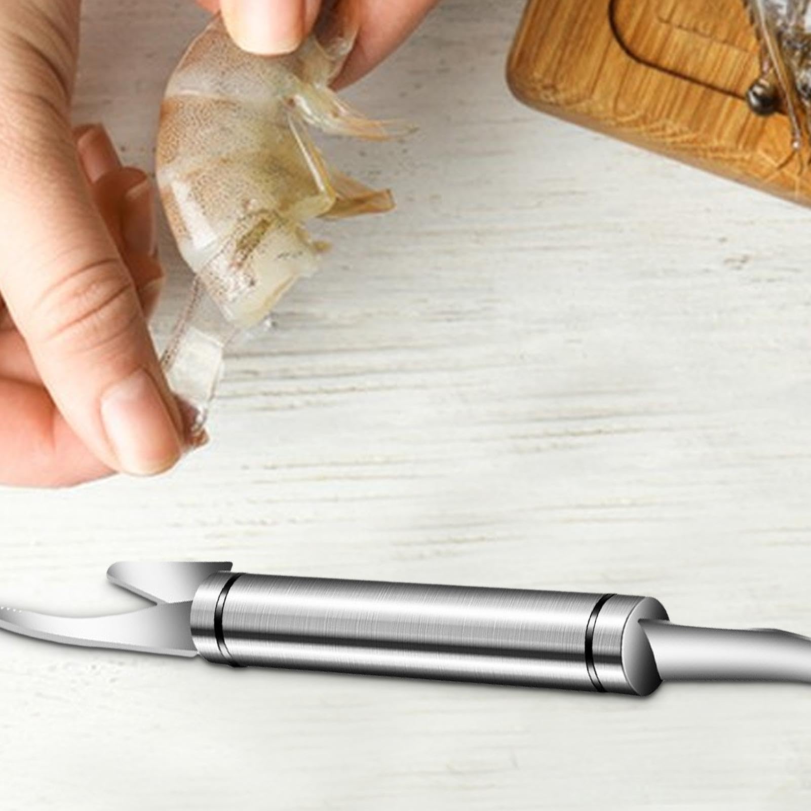 Garnelen schälen war noch nie so einfach! Dieser praktische Garnelenschäler aus Edelstahl (2.4×18 cm) macht die lästige Arbeit zum Kinderspiel. Mit einer Handbewegung sind deine Garnelen geschält und gereinigt - spart Zeit und Nerven in der Küche! Der ergonomische Griff liegt perfekt in der Hand, die gebogene Form passt sich optimal den Garnelen an. Super für Langusten, Shrimps und alle Meeresfrüchte. Kompakt und platzsparend - ideal für die Schublade. Ob Profikoch oder Hobbykoch - dieses Tool gehört in jede Küche! Einfache Reinigung, lange Haltbarkeit und perfekte Ergebnisse garantiert.