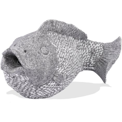 Boah, dieser Wasserspeier-Fisch ist ja mal der Hammer für deinen Garten! Aus hochwertigem Polyresin gemacht, sieht der aus wie echter Naturstein - aber ist viel leichter und einfacher zu handhaben. Mit 41x23x22 cm ist die Figur genau die richtige Größe für Teich, Brunnen oder ne Wasserschale. \\n\\nDas beste: Der hat schon nen 3 Meter langen Schlauch dabei (8/12 mm Anschluss). Du brauchst nur ne Pumpe mit min. 250 l/h - dann schießt der Wasserstrahl bis zu 40 cm weit! Sieht nicht nur mega aus, sondern belüftet deinen Teich auch noch super. \\n\\nEinfach Pumpe anschließen und schon plätschert's gemütlich vor sich hin. Perfekte Entspannung für laue Sommerabende! Im Winter am besten einlagern, dann hält der ewig. Ein richtig schönes Geschenk für Gartenliebhaber - damit macht jeder Teich was her!