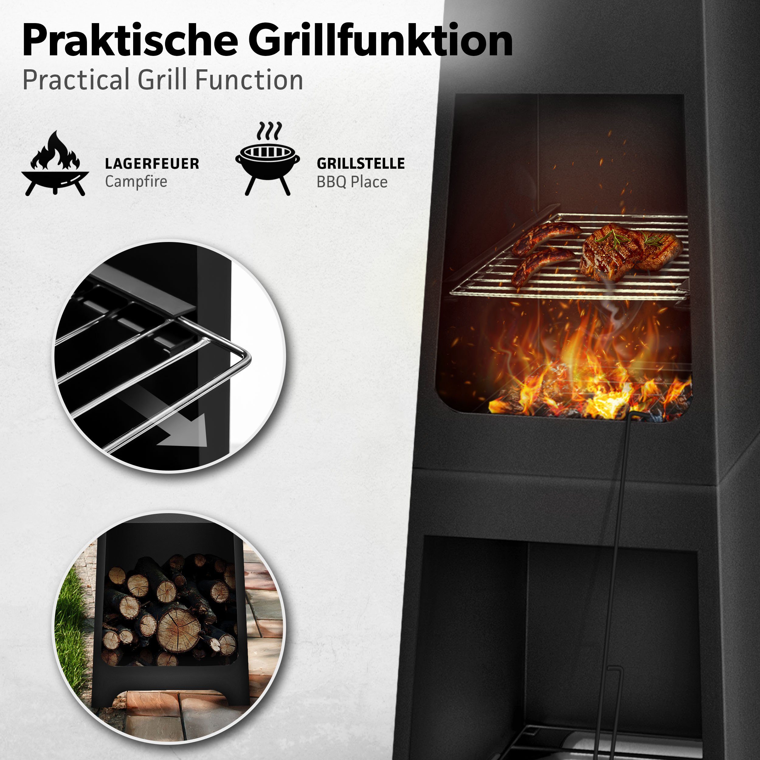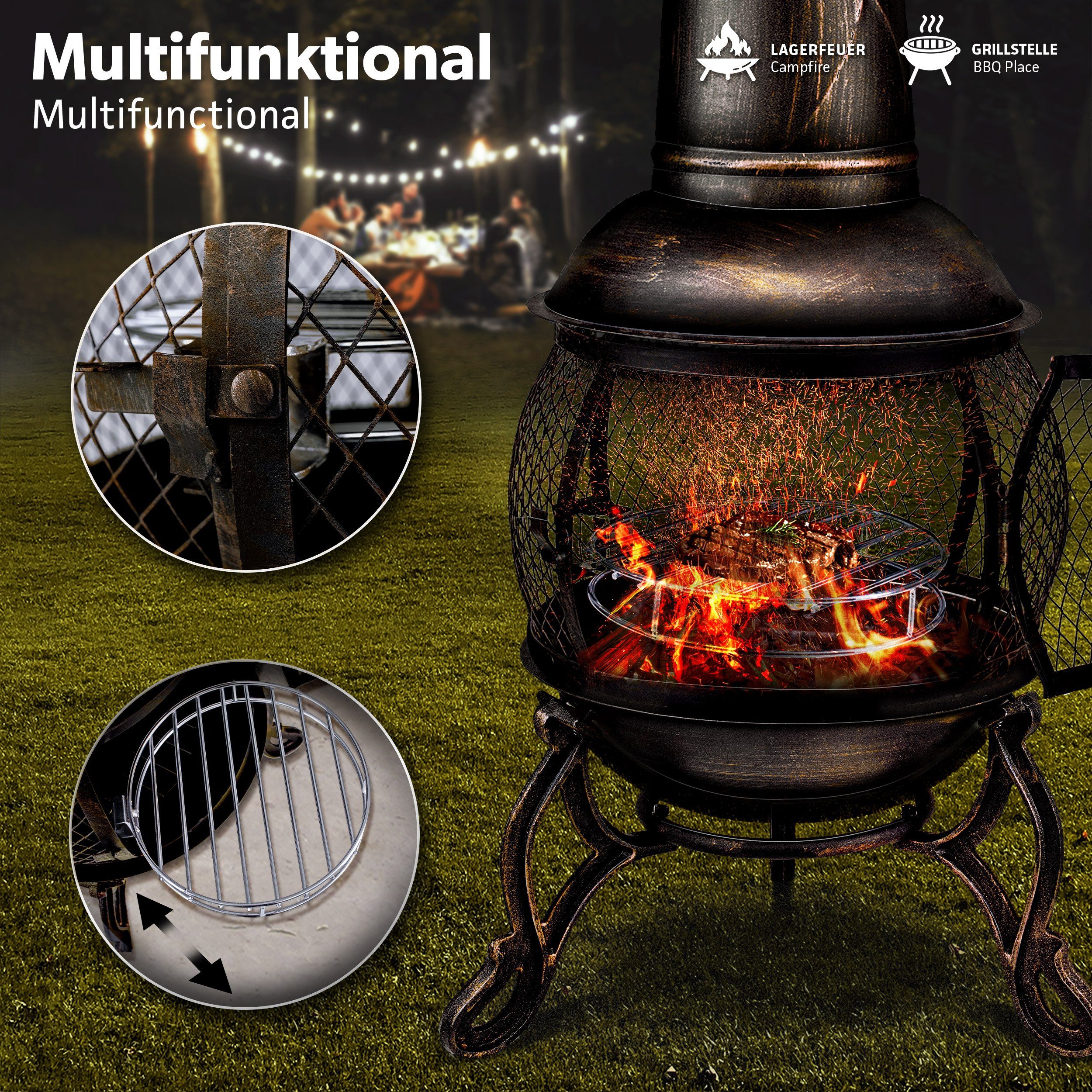 Leute, dieser Tillvex Terrassenofen ist der absolute Hammer für euren Garten! Aus robustem Gusseisen und Stahl, 90cm hoch und mit drei stabilen Standfüßen. Könnt ihr als gemütliche Feuerstelle nutzen ODER als praktischen Grill - einfach den Grillrost auflegen! Im Lieferumfang ist alles dabei: Grillrost, Kohlerost, Schürhaken, Grillzange, Bürste und sogar eine wasserdichte Abdeckplane. Das Funkenschutzgitter sorgt für Sicherheit, die Tür hat ein Verriegelungssystem. Perfekt für gemütliche Abende mit Freunden, Lagerfeuer-Atmosphäre oder Grillpartys. Macht richtig warm und sieht dazu noch super aus im antiken Design. Ob Camping, Gartenparty oder einfach nur ein entspannter Abend - mit diesem Ofen wird's perfekt!