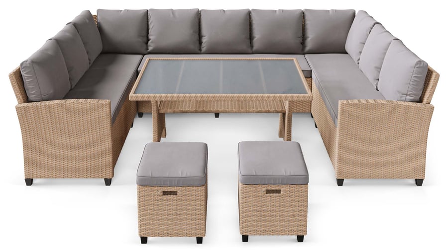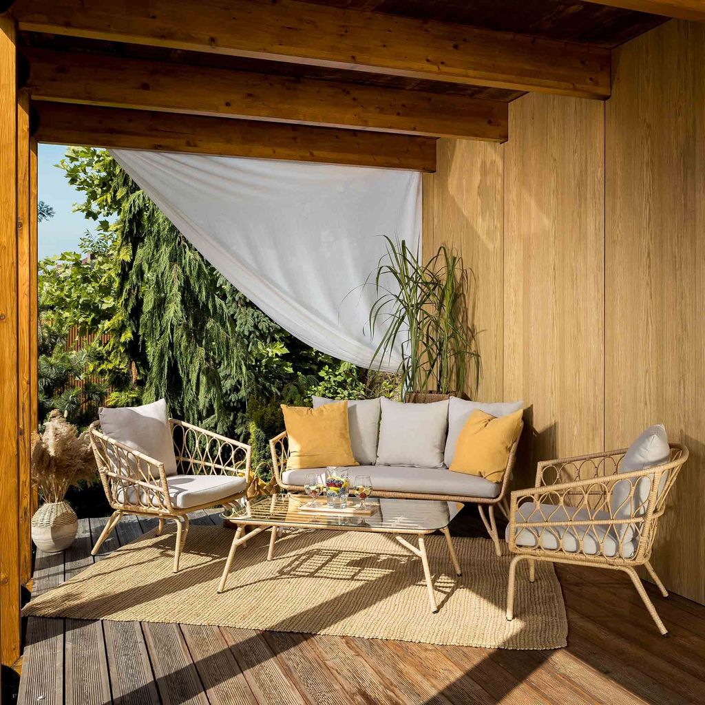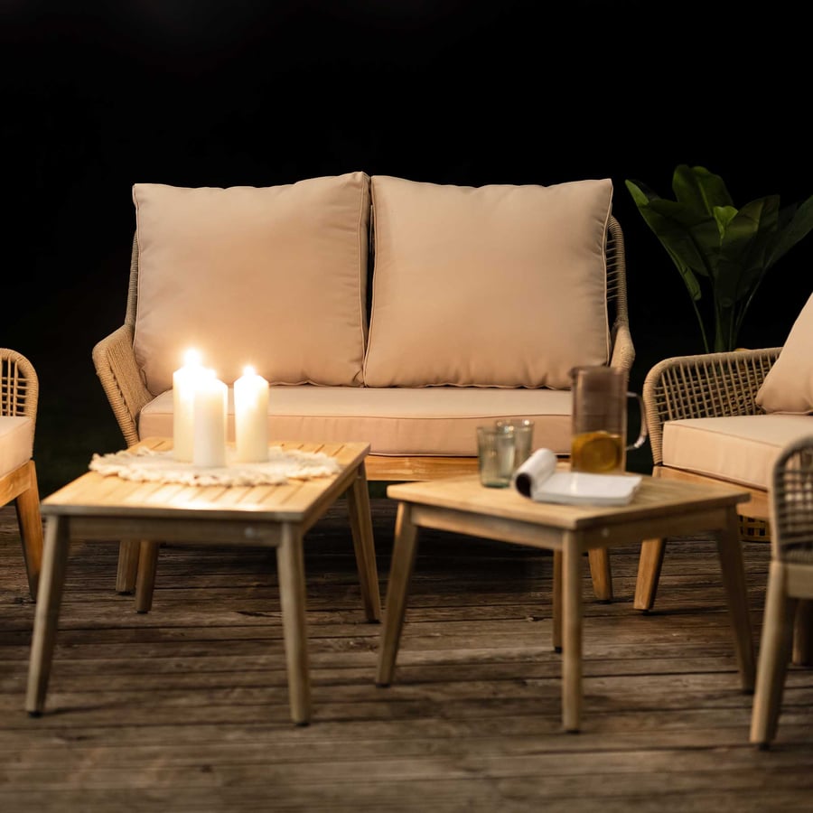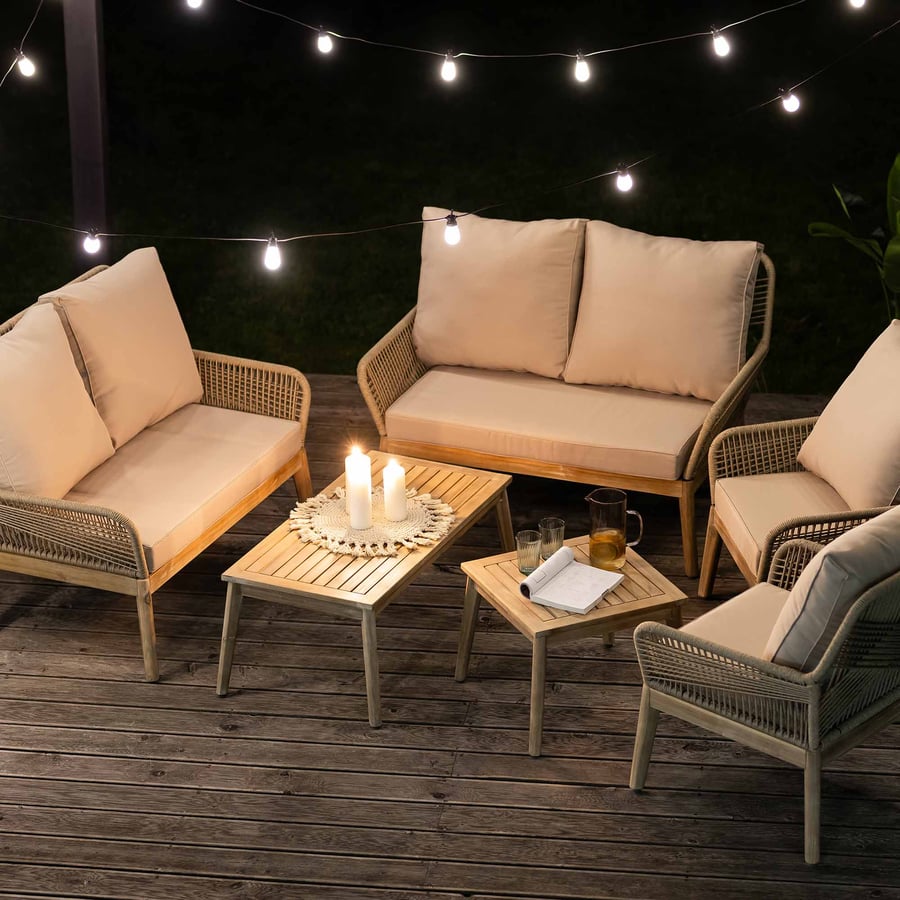 Wow, dieses Gartenmöbel-Set von di volio ist einfach der Hammer! Bestehend aus einem gemütlichen Doppelsofa, zwei Sesseln und einem runden Couchtisch - perfekt für entspannte Stunden im Garten. Aus FSC-zertifiziertem Akazienholz gefertigt, das super wetterfest ist und ewig hält. Die dicken Kissen sind ein Traum: Sitzkissen 20 cm dick, Rückenkissen 25 cm - da sitzt man wie auf Wolken! Die Bezüge sind wasser- und schmutzabweisend und mit Reißverschluss zum einfachen Abnehmen. Der runde Tisch mit 80 cm Durchmesser ist ideal für Getränke oder Snacks. Das Design mit dem trendigen Seilgeflecht sieht einfach klasse aus und bringt einen Hauch von Luxus auf deine Terrasse. Übrigens: Mit der passenden Schutzhülle (separat erhältlich) bleiben die Möbel auch bei schlechtem Wetter top in Schuss. Einfach aufbauen und sofort loslounge - mehr Komfort geht nicht!