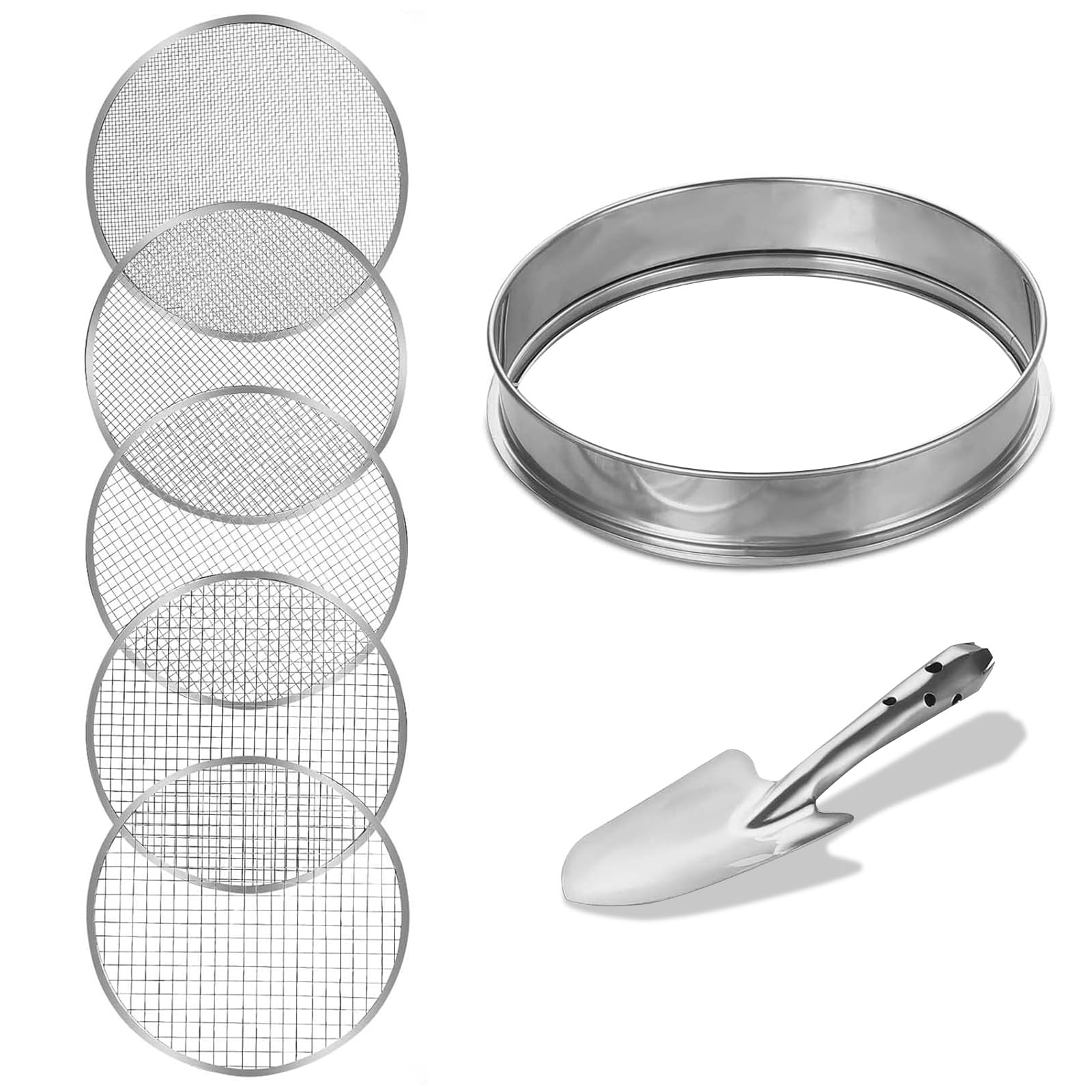 Perfekt für alle, die hochwertige Erde und Kompost selbst herstellen wollen! Dieses professionelle Gartensieb-Set enthält 7 verschiedene Siebe mit Maschenweiten von 1mm bis 5mm (1mm, 1.5mm, 2.0mm, 2.8mm, 3.8mm, 4.3mm, 5.0mm). So kannst du für jede Pflanze die ideale Bodenkonsistenz erreichen - feine Siebe für empfindliche Keimlinge, gröbere für allgemeine Gartenarbeit. Alle Siebe sind aus rostbeständigem Edelstahl gefertigt und halten auch bei feuchter Gartenarbeit lange. Die stabilen Holzgriffe liegen angenehm in der Hand und reduzieren die Ermüdung bei längerer Arbeit. Besonders praktisch: Die Siebe sind so konstruiert, dass sie auch mit hartem Boden und Kompost problemlos zurechtkommen, ohne sich zu verbiegen. Einfach die gewünschte Maschenweite auswählen, Erde oder Kompost aufgeben und sieben - schon trennst du effektiv Schmutz von nährstoffreichen Materialien. Ideal für die Vorbereitung von Blumenbeeten, Anzuchterde oder das Sieben von Kompost. Nach Gebrauch einfach mit Wasser abspülen - Erde und Schmutz lösen sich leicht. Leicht genug für bequemes Handling, aber stabil genug für jahrelangen Einsatz. Deine Pflanzen werden es dir mit üppigem Wuchs danken!