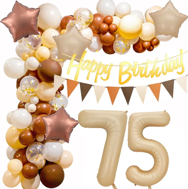 Alles für die perfekte 75. Geburtstagsfeier! Dieses komplett Rosegold Deko-Set lässt keinen Wunsch offen. Enthalten sind: ein riesiger 32 Zoll '75' Folienballon, Happy Birthday Girlande, Dreiecksflaggen, 16 bunte Latexballons, 6 Konfetti-Ballons, 2 Stern-Folienballons, Tortendeko und Bänder. Die hochwertigen Ballons halten lange und können mit Helium oder Luft befüllt werden. Einfach zu montieren - ob an Decke, Wand oder als Tischdekoration. Spare Zeit und Geld, denn dieses Set enthält wirklich alles was du für eine unvergessliche Feier brauchst. Tipp für die Konfetti-Ballons: Einfach vorher an einem Handtuch reiben für den statischen Effekt! Mach die Geburtstagsfeier deiner Liebsten zu einem magischen Erlebnis.
