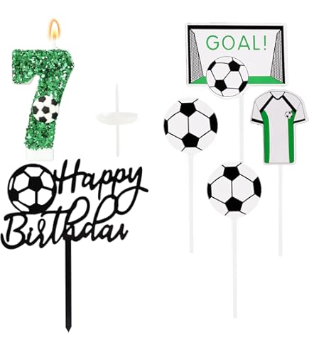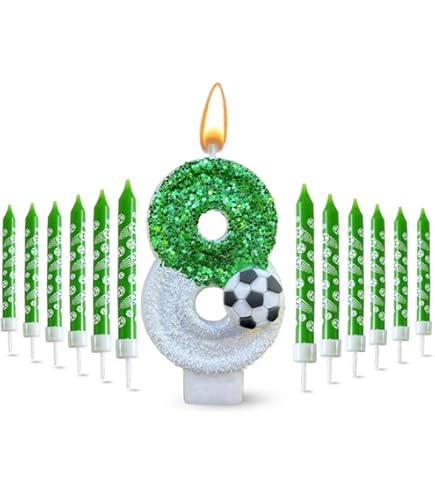Alles Gute zum Achten! Diese coole Geburtstagskerze in Fußball-Optik ist der Hit auf jeder Geburtstagstorte. Die grüne Kerze mit funkelnden Pailletten und Fußball-Deko bringt sofort Partystimmung auf den Kuchen. Im Set enthalten sind neben der Zahl 8 auch ein 'Happy Birthday' Cake Topper und 4 weitere Fußball-Deko-Elemente - alles frei kombinierbar für deine individuelle Tortenkreation. Die Kerze ist etwa 6cm hoch (mit Stiel 12,5cm) und passt perfekt auf die meisten Geburtstagstorten. Aus umweltfreundlichen, geruchlosen Materialien hergestellt - sicher für dein Kind. Besonders beliebt für Jungsgeburtstage, Fußball-Partys oder einfach für kleine Sportfans. Wichtig: Brennende Kerzen nie unbeaufsichtigt lassen und außerhalb der Reichweite von Kindern aufstellen. Mach den Geburtstag deines Kindes mit dieser besonderen Kerze zu einem unvergesslichen Erlebnis!