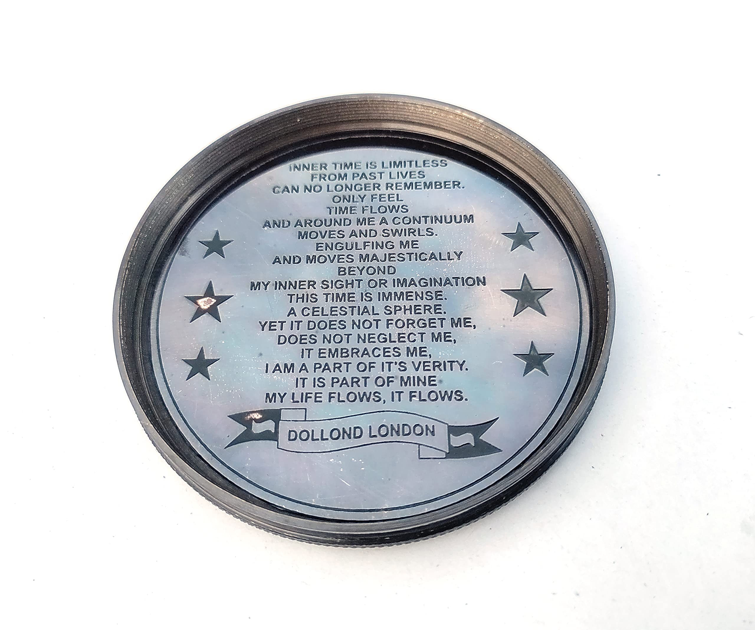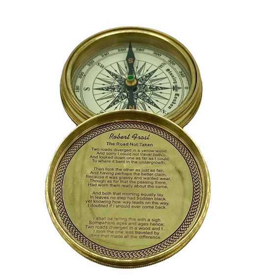 Wow, dieser Robert Frost Kompass ist ja mal ein richtig besonderes Stück! Aus massivem Messing gefertigt und mit einem Durchmesser von 5,1 cm perfekt für die Tasche oder als besonderes Accessoire. Das goldfarbene Finish sieht super edel aus und der Innendeckel ist mit dem berühmten Gedicht 'The Road Not Taken' graviert - einfach poetisch! Handgefertigt und in funktionstüchtigem Zustand - nicht nur zum Anschauen, sondern auch praktisch nutzbar. Perfekt als Geschenk für Literatur-Fans, Reisende oder Sammler. Ob auf dem Schreibtisch, im Regal oder in der Jackentasche - dieser Kompass macht überall eine gute Figur! Einfach mal in die Hand nehmen und die hochwertige Verarbeitung spüren. Ein zeitloses Stück, das garantiert Gesprächsstoff liefert!