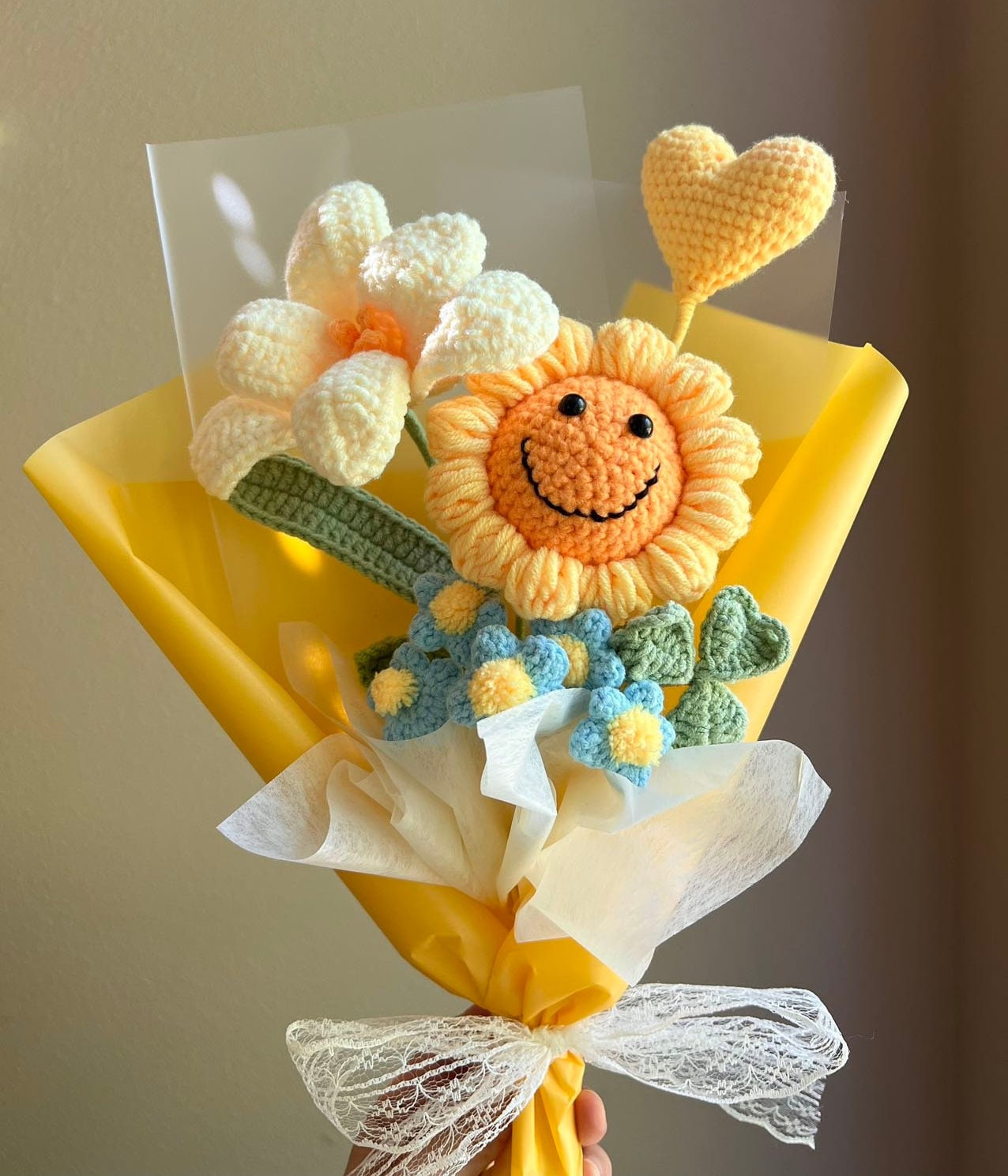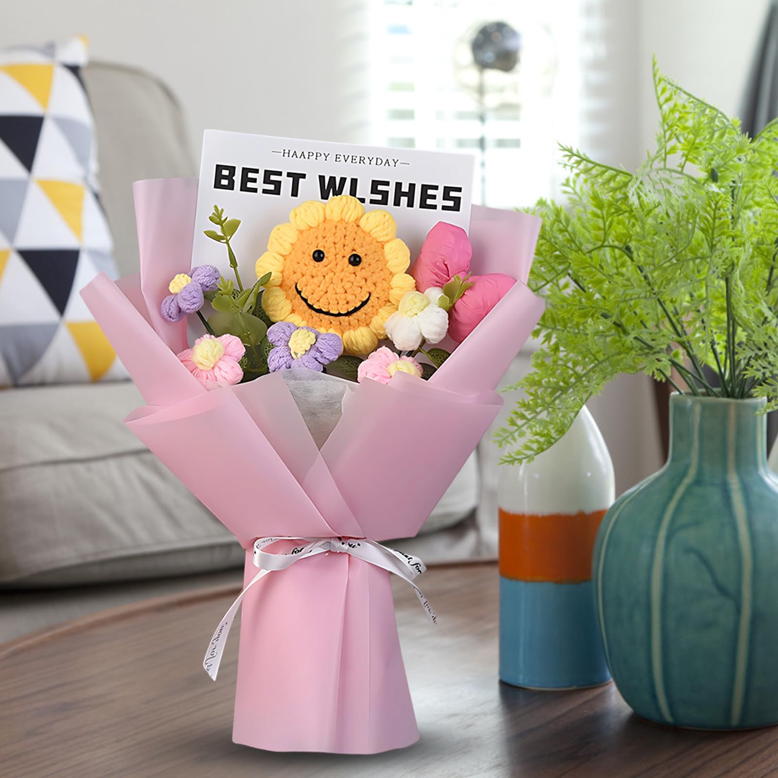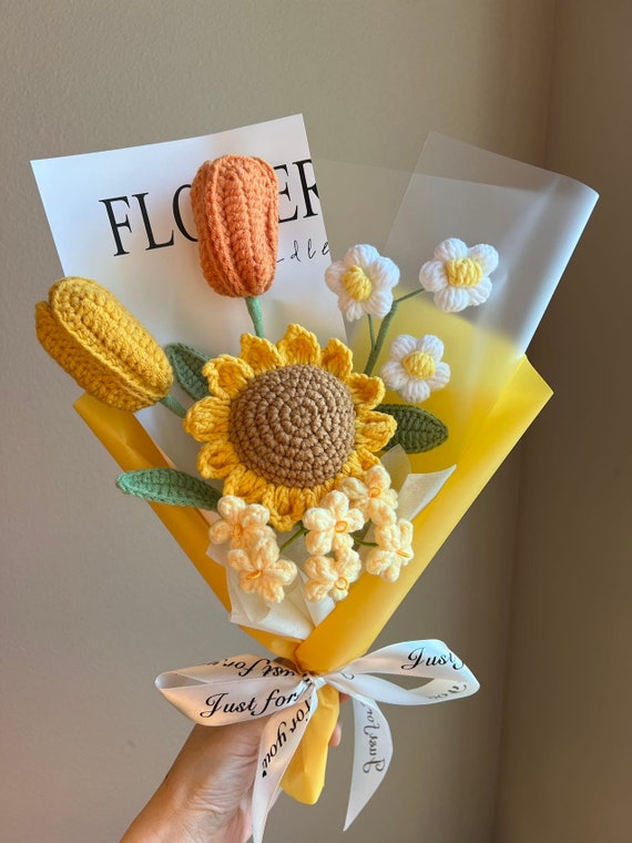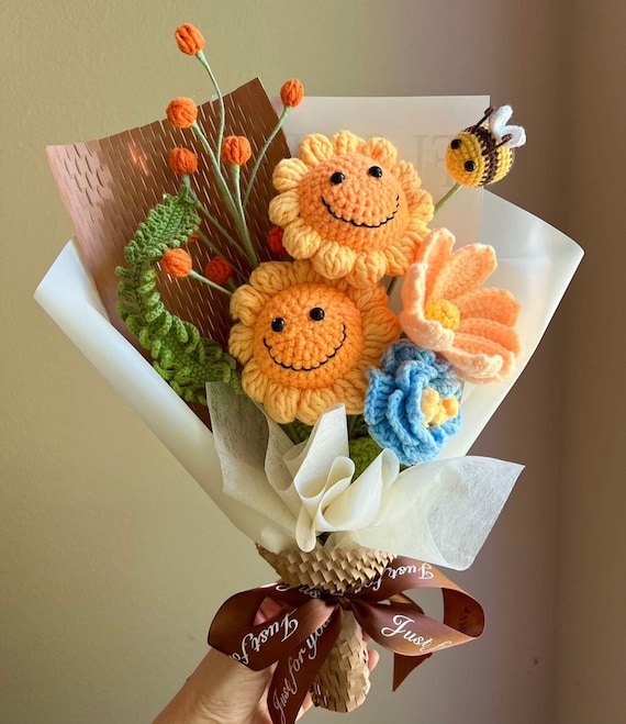 Blumen, die niemals welken - dieser bezaubernde gehäkelte Blumenstrauß ist ein ganz besonderes Geschenk! Handgefertigt mit liebevollen Details, kombiniert er fröhliche Sonnenblumen mit einer zarten rosa Schleife. Mit 30 cm Höhe und 16 cm Breite ist er ein echter Hingucker in jeder Vase. Anders als echte Blumen behalten diese Häkelblumen für immer ihre Schönheit - sie symbolisieren ewige Zuneigung und Liebe. Perfekt als Geschenk für Jubiläen, Geburtstage, Abschlussfeiern oder einfach als Zeichen der Dankbarkeit. Auch als Deko für Zuhause oder im Büro macht dieser Strauß eine tolle Figur. Jede Blume wird sorgfältig von Hand gehäkelt - ein Unikat mit persönlichem Charme. Die lächelnden Sonnenblumen verbreiten gute Laune, und die rosa Schleife rundet das Gesamtbild perfekt ab. Ein Geschenk, das von Herzen kommt und bleibende Erinnerungen schafft. Für Menschen, die dir besonders am Herzen liegen - zeige deine Gefühle auf eine einzigartige und kreative Weise! Einfach in die Vase stellen und sich jeden Tag daran erfreuen. Für alle, die das Besondere lieben und Wert auf handgefertigte Qualität legen. Ein Stück Kunst, das Emotionen weckt!