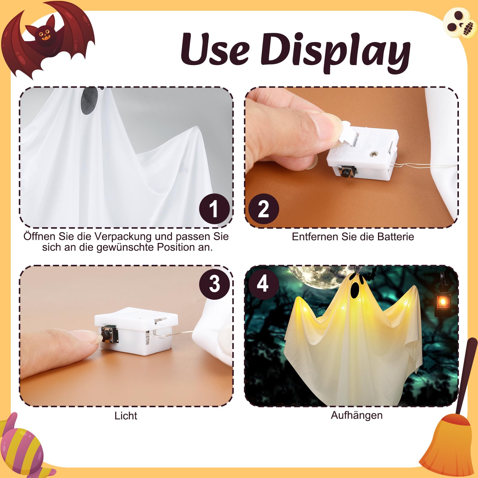 Boah, diese Halloween-Geister sind einfach der Hammer! Kommen als 3er-Set, jeder 70cm groß und mit LED-Lichtern ausgestattet. Die weißen Stoffgeister schweben richtig gruselig im Wind und sorgen für perfekte Halloween-Stimmung. Das Besondere: Die LEDs haben drei Modi - Dauerlicht, langsames und schnelles Blinken. Einfach den Knopf drücken zum Wechseln. Aus hochwertigem Stoff, Kunststoff und Draht gemacht, total reißfest. Mit Aufhängeseil - einfach an Bäume, Türen oder die Veranda hängen. Perfekt für Vorgarten, Terrasse oder drinnen. Machen jede Halloween-Party zum Erlebnis! Die Gesichter sind richtig schön gruselig gestaltet und leuchten nachts super creepy. Einfach aufhängen und fertig - die gruselige Atmosphäre kommt von alleine!