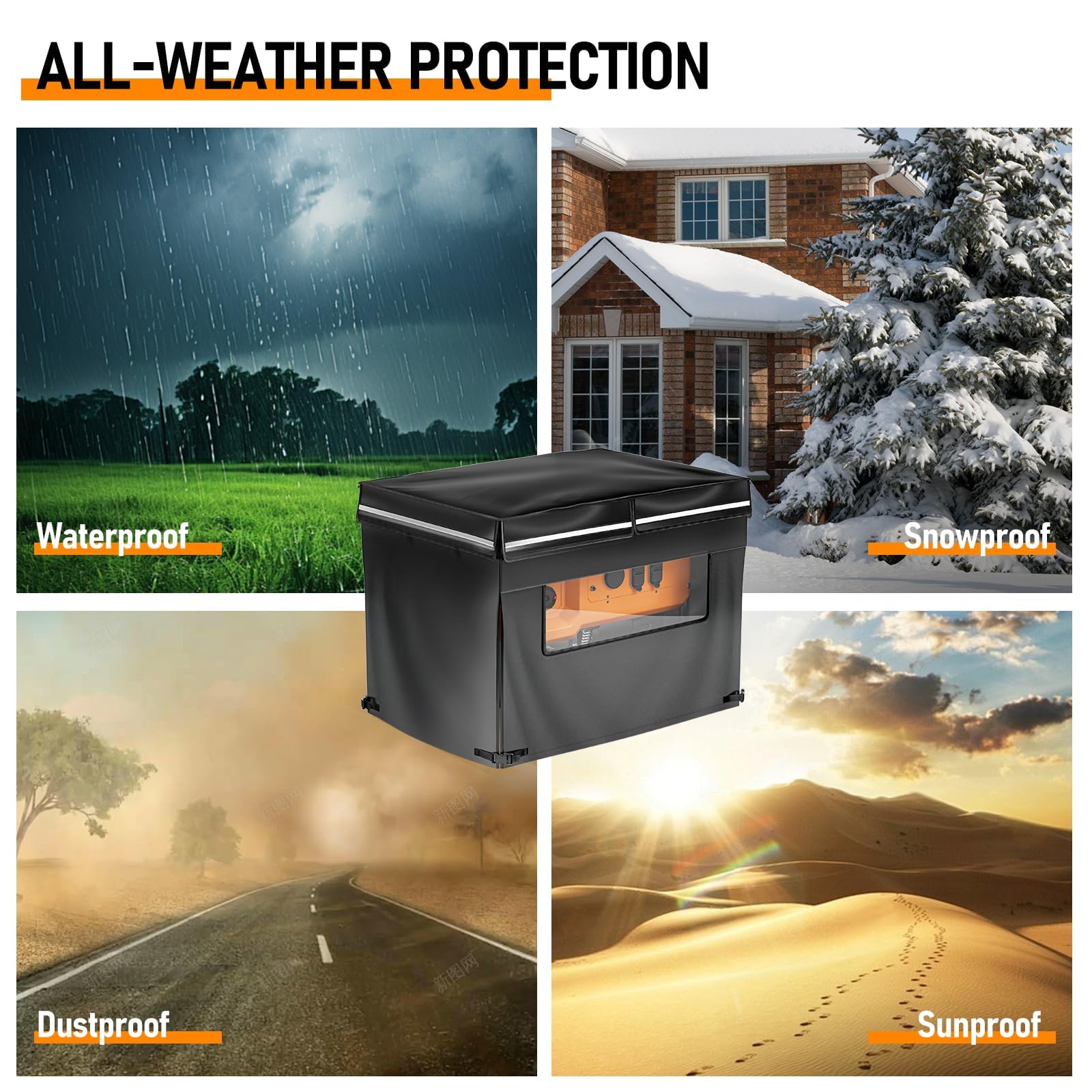 Der verstellbare Schnallenriemen und das Schwingseil unten sorgen für perfekten Sitz bei verschiedenen Generator-Formen. Mit integriertem Griff für einfaches Handhaben und einer praktischen Tasche für Kleinteile. In 82x61x61cm für die meisten handelsüblichen Generatoren geeignet.
