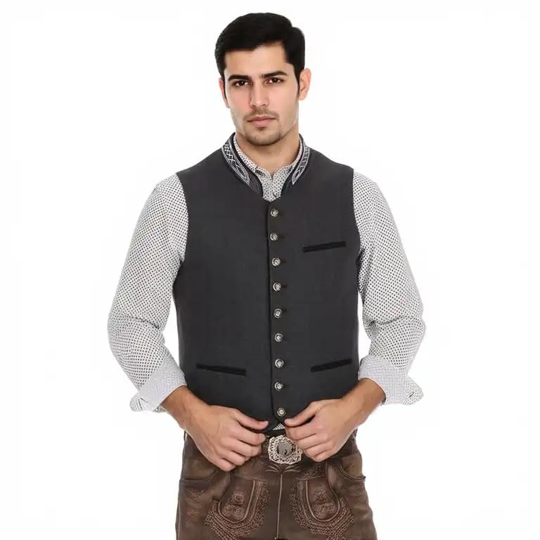 Perfekt gekleidet fürs Oktoberfest! Diese ärmellose Trachtenweste für Herren im Vintage-Design mit Stehkragen macht jede Tracht komplett. Aus hochwertigem Material für Komfort und Langlebigkeit. Mit praktischen Druckknöpfen und schlanker Passform sitzt sie wie angegossen. Perfekt kombinierbar mit Trachtenhemd, Lederhose oder Trachtenjacke. Ob als Bräutigam auf der Hochzeit oder beim Oktoberfest-Besuch - mit dieser Weste bist du stilvoll unterwegs. In verschiedenen Größen erhältlich für perfekte Passform. Ein tolles Geschenk für alle Trachten-Fans! Mach dein Outfit damit komplett und feiere in traditionellem Style!