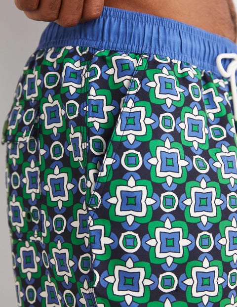 Perfekt für den Sommer! Diese Herren Badehose mit coolem geometrischem Muster sieht nicht nur gut aus, sondern ist auch super praktisch. Aus weichem, schnelltrocknendem Material das angenehm auf der Haut liegt. Mit elastischem Bund und Kordelzug für perfekten Sitz - da passt sie immer! Die Länge von etwa 47-49,5 cm bedeckt das Knie und sorgt für modernen Look. Besonders praktisch: Das Netzfutter innen und die seitliche Cargotasche. Ideal für alle Wassersportarten oder einfach für den Strandurlaub. Ob Schwimmen, Beachvolleyball oder nur Sonnenbaden - mit dieser Hose bist du bestens ausgestattet. Sie trocknet schnell und behält ihre Form. Ein Must-Have für jeden Sommer!