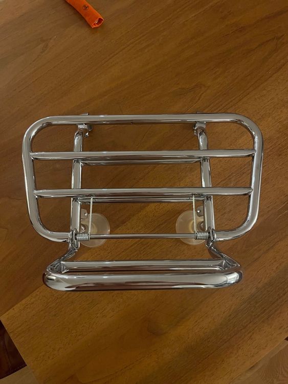 Mehr Transportmöglichkeiten für deinen Roller! Dieser chromglänzende Vordergepäckträger passt perfekt auf Vespa PX und LML Modelle. Aus hochwertigem verchromtem Stahl gefertigt - rostbeständig und langlebig. Einfache Montage direkt vorne am Roller, ohne komplizierte Umbauten. Ideal zum Transport von Taschen, kleinen Koffern oder als Basis für zusätzliche Halterungen. Der klassische Chrom-Look unterstreicht den Retro-Charme deiner Vespa oder LML. Perfekt für den täglichen Gebrauch oder für längere Touren, wenn du etwas mehr Stauraum benötigst. Robust konstruiert für zuverlässigen Halt auch bei stärkerer Belastung. Mach deinen Roller noch praktischer und stylischer mit diesem funktionalen Zubehörteil. Einfach montiert - große Wirkung!