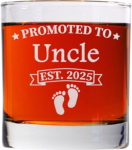 Das perfekte Geschenk zur Schwangerschaftsankündigung! Dieses stylische Whiskyglas mit der Gravur 'Promoted to Uncle Est 2025' ist ein echter Hingucker. Mit 325ml Fassungsvermögen und splitterfreiem Rand ist es perfekt für Whisky, Scotch, Bourbon oder Cocktails. Der schwere Boden gibt dem Glas Stabilität und ein hochwertiges Gefühl. Die Gravur ist dauerhaft und wäscht sich nicht ab. Sorgfältig in einer Geschenkbox verpackt - ideal zum Verschenken an werdende Väter, Onkel oder stolze Großväter. Ein persönliches und humorvolles Geschenk, das garantiert für Freude sorgt!