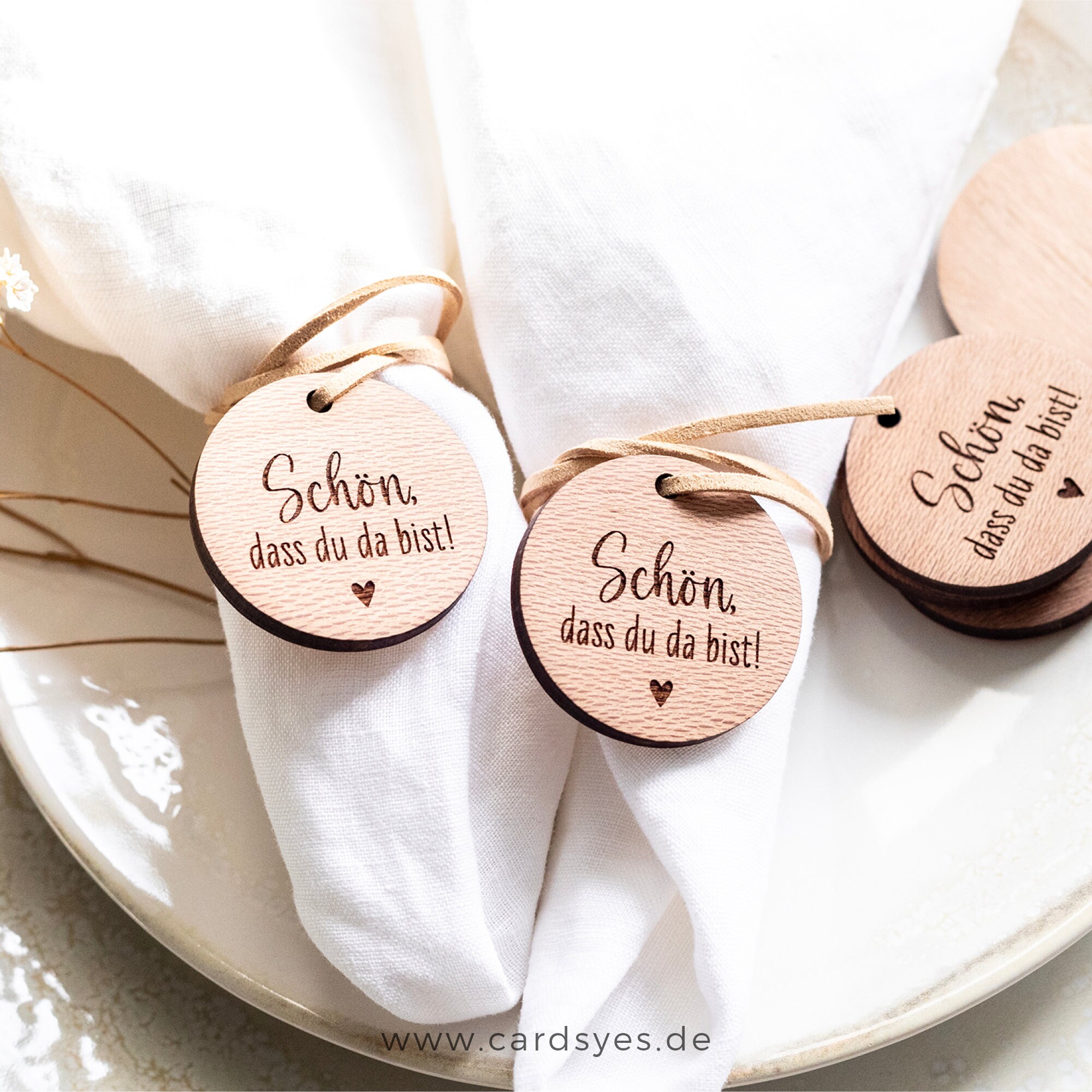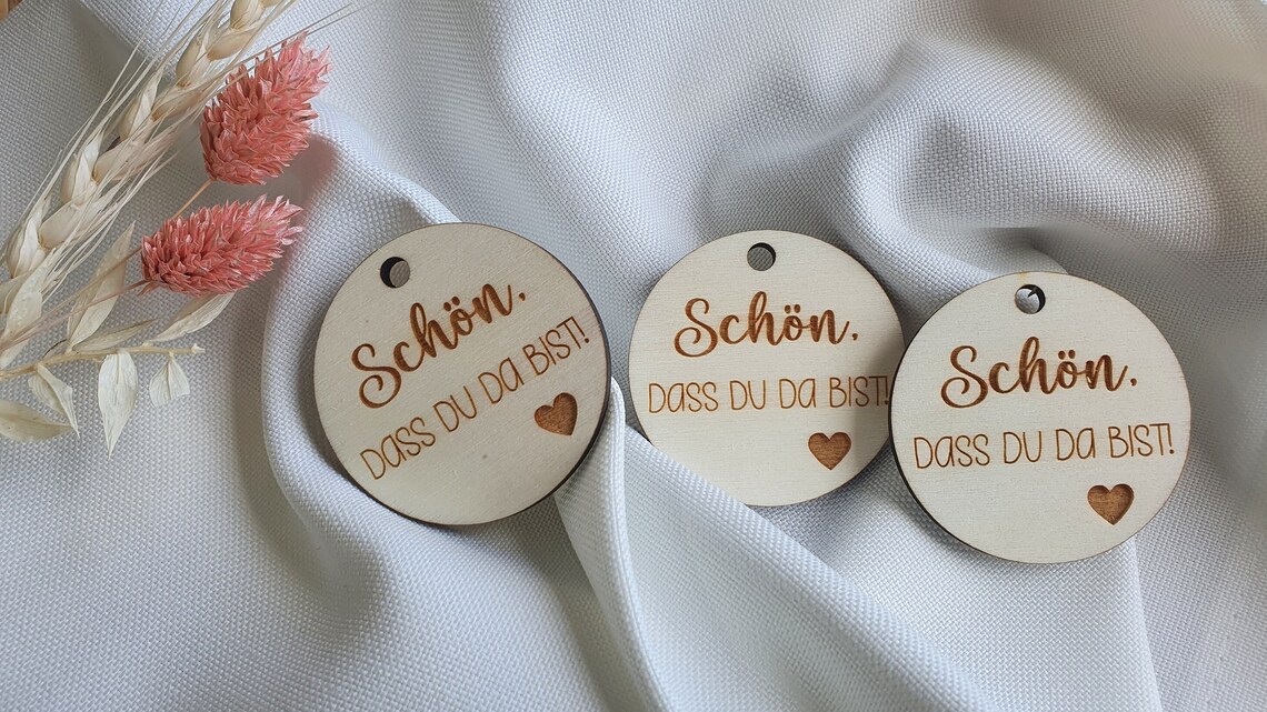 Diese süßen Holz-Anhänger mit der Aufschrift 'Schön Dass Du Da Bist' sind perfekt für besondere Anlässe! Im Set sind 50 Stück in Fischform (5x2 cm) enthalten, plus 5 Meter Juteschnur zum Befestigen. Ideal zum Verzieren von Geschenken zur Taufe, Kommunion, Konfirmation oder Geburtstag. Aber auch als Tischdeko oder Streudeko machen sie eine super Figur. Aus natürlichem Holz gefertigt, verleihen sie jedem Fest eine persönliche Note. Einfach anbringen und deine Gäste damit überraschen!
