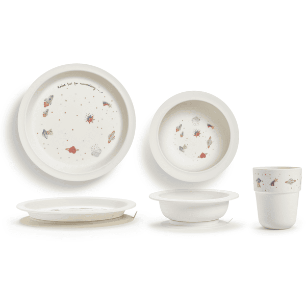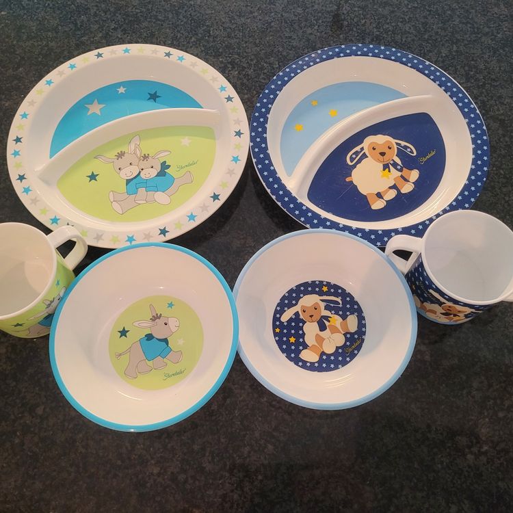 Dieses Sterntaler Geschirrset mit dem süßen Fuchs Filou ist ja perfekt für die Kleinen! 5-teilig mit allem was man braucht: Teller, Schüssel, Trinkbecher und Besteck. In moderner, eckiger Form - sieht total stylisch aus! Aus robustem PP-Kunststoff, absolut lebensmittelecht und spülmaschinenfest. Die lichtgraue Farbe mit dem Fuchs-Motiv ist einfach niedlich. Macht jedes Essen für Kinder zum Erlebnis! Ob für zuhause, den Kindergarten oder unterwegs - dieses Geschirr hält was aus und sieht dabei super aus. Perfekt als Geschenk zum Geburtstag, zu Weihnachten oder einfach so. Einfach abwaschen und immer wieder verwenden - praktisch und nachhaltig! Damit essen Kinder gleich doppelt so gerne!