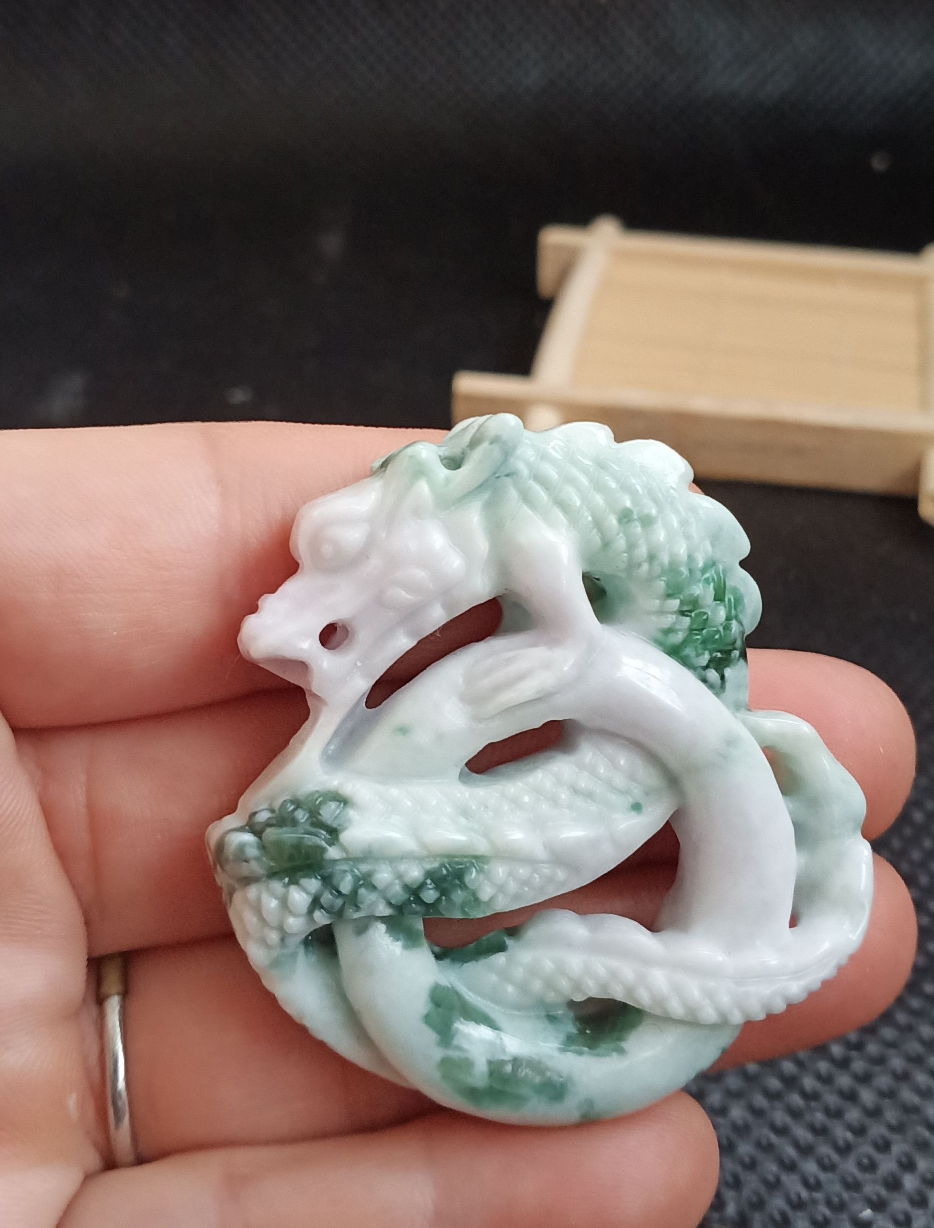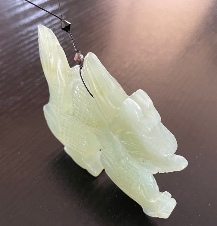 Dieser Jade-Anhänger ist einfach atemberaubend schön! Aus echter natürlicher Hetian-Jade handgeschnitzt, zeigt er ein detailreiches Drachen-Motiv - in der asiatischen Kultur ein Symbol für Stärke und Glück. Mit den Maßen 56x48x12mm ist er ein echter Hingucker, aber nicht zu aufdringlich. Jedes Stück ist ein Unikat, denn natürliche Jade hat immer ihre eigenen charakteristischen Maserungen und Farbspiele. Der Anhänger soll Glück bringen und positive Energie verbreiten - perfekt also als persönliches Maskottchen oder als besonderes Geschenk. Die polierte Oberfläche fühlt sich wunderbar glatt an und die Handwerkskunst ist einfach erstklassig. Ob für Männer oder Frauen - dieser Anhänger verleiht jedem Outfit eine besondere Eleganz. Trag ihn als Zeichen deiner Individualität oder schenk ihn jemandem, dem du viel Glück wünschst. Ein Schmuckstück, das Geschichten erzählt und sicher zum Lieblingsstück wird!