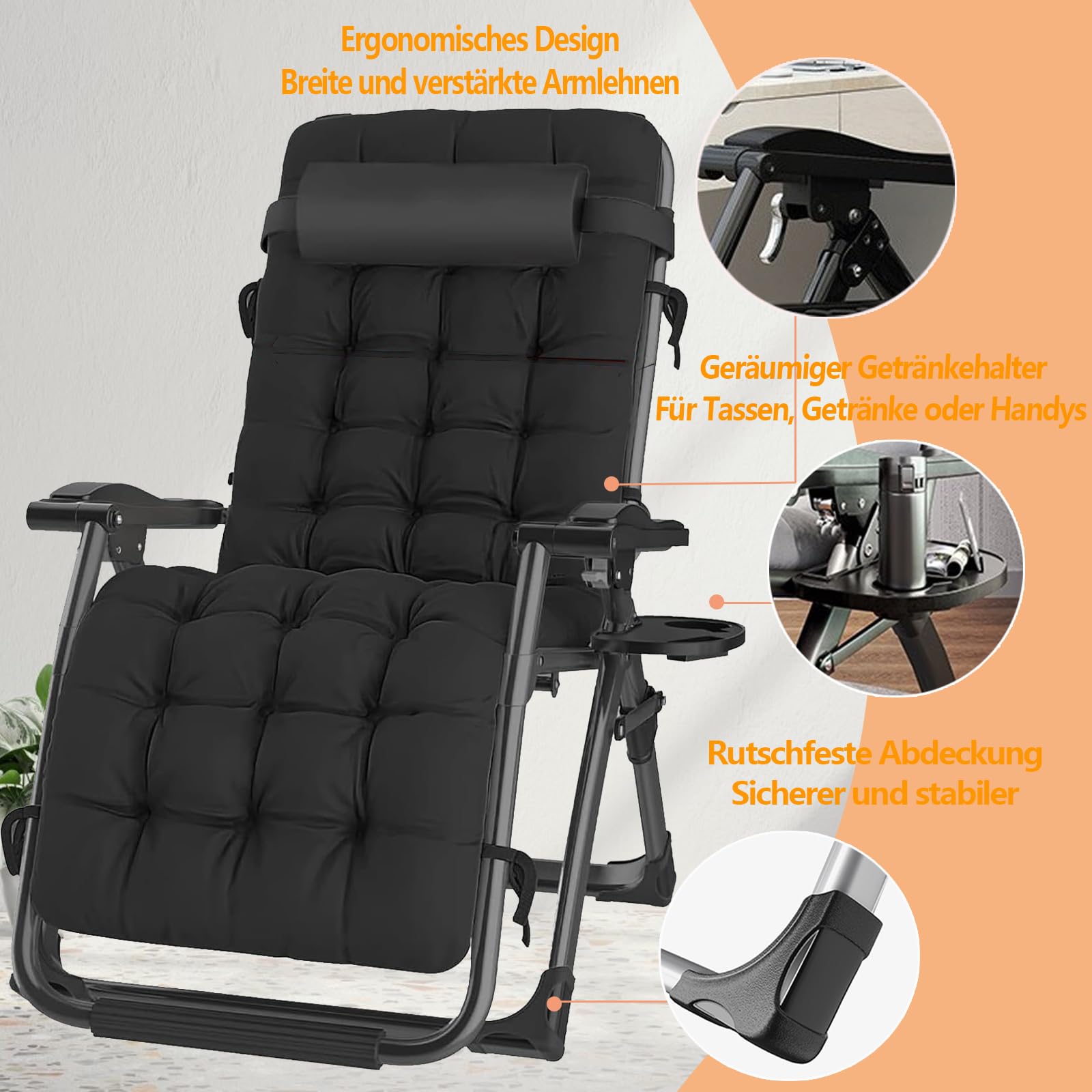 Endlich eine Liege, die wirklich hält was sie verspricht! Mit bis zu 200kg Belastbarkeit ist diese Klappliege super stabil - dank dickeren Stahlrohren und robuster Dreieckskonstruktion. Die rutschfesten Füße geben zusätzlichen Halt, egal ob auf Terrasse, Balkon oder am Strand. Du kannst die Rückenlehne stufenlos von 90 bis 170 Grad verstellen - perfekt fürs Sonnenbaden, Lesen oder einfach nur Entspannen. Die Verstellmechanik aus Aluminiumlegierung ist einfach zu bedienen und hält sicher in jeder Position. Mit dem abnehmbaren Sitzkissen aus Perlbaumwolle liegst du bequem den ganzen Tag. Die weiche Kopfstütze entlastet Nacken und Rücken - ideal wenn du Rückenschmerzen hast! Der seitliche Getränkehalter hält dein Getränk immer in Reichweite. Und das Beste: Die Liege ist schon fertig montiert und lässt sich einfach zusammenklappen - super praktisch für unterwegs! Ob im Garten, auf dem Balkon, am Pool oder Strand - diese Liege ist dein perfekter Begleiter für entspannte Stunden. Leicht zu transportieren und platzsparend zu verstauen. Einfach ausklappen, hinlegen und genießen!