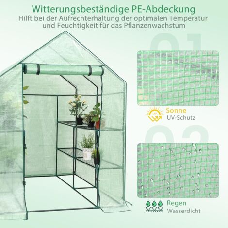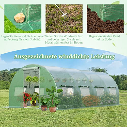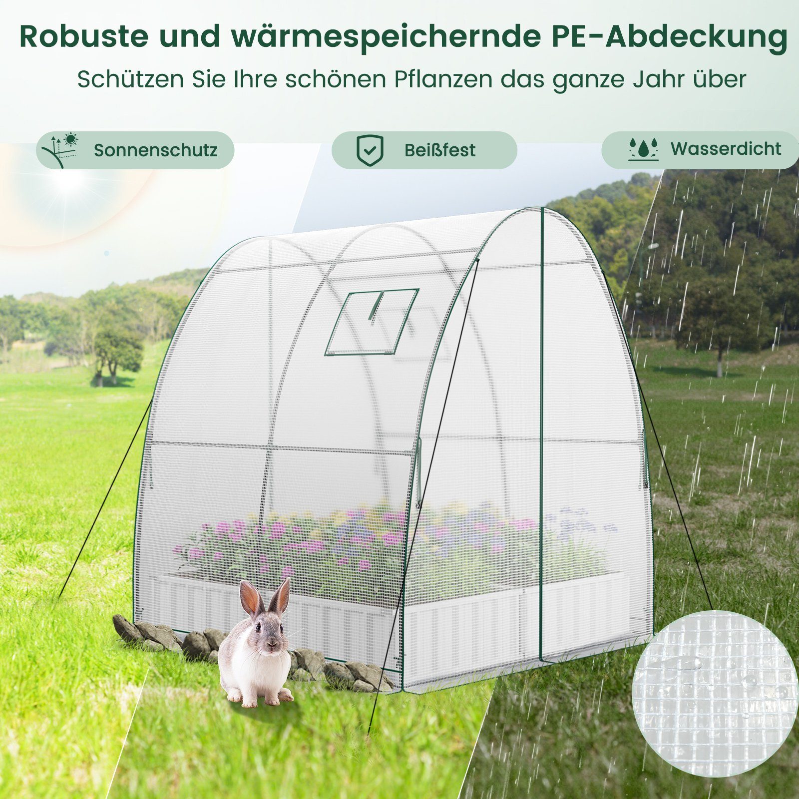 Perfekter Pflanzenschutz das ganze Jahr! Dieses praktische Gewächshaus von COSTWAY mit den Maßen 180x250x230cm bietet reichlich Platz für deine Pflanzen. Die robuste PE-Gitterfolie und das stabile Metallgestell schützen zuverlässig vor Witterungseinflüssen. Besonders praktisch: Die beiden aufrollbaren Türen und 2 großen Fenster (150x64cm) ermöglichen einfachen Zugang und gute Belüftung. Mit Klettverschlüssen an allen Ecken für sicheren Halt. Das Pop-up-Design ermöglicht schnellen Auf- und Abbau - ideal auch für Saisonnutzung. Inklusive 10 Heringen, 4 Ankern und Seilen für zusätzliche Stabilität bei Wind. Perfekt für Tomaten, Gemüse, Kräuter oder empfindliche Pflanzen. Mit 15,3kg robust genug für dauerhaften Einsatz, aber dennoch leicht zu transportieren. Deine Pflanzen werden es dir danken!
