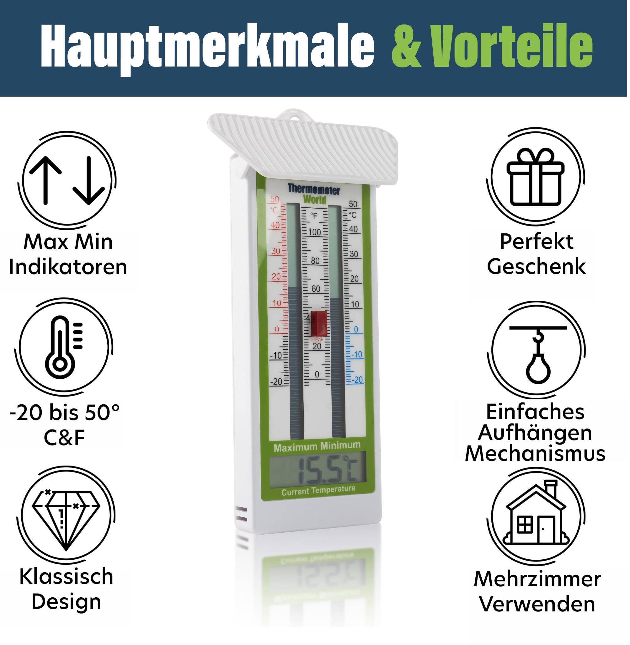 Immer den Überblick über die Temperaturen! Dieses digitale Thermometer zeigt dir nicht nur die aktuelle Temperatur an, sondern auch die Höchst- und Tiefstwerte - perfekt für Gewächshäuser, Garten oder Wohnung. Mit schützendem Dach für den Außeneinsatz und einfacher Wandmontage. Inklusive AAA-Batterie, sodass du sofort loslegen kannst. Ein ideales Geschenk für Hobbygärtner oder alle, die es genau wissen wollen. Das Thermometer World-Team steht bei Fragen zur Seite. Endlich siehst du auf einen Blick, wie kalt oder warm es wirklich war!