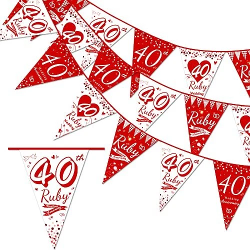 Herzlichen Glückwunsch zum 40. Hochzeitstag! Diese wunderschöne Rubinhochzeit-Girlande macht die Feier perfekt. Ganze 4,7 Meter lang mit 16 festlichen Wimpeln in Rot und Weiß. Jeder Wimpel misst 19x28cm - also schön groß und gut sichtbar. Aus hochwertigem Papier und Stoff gefertigt, mit Schutzschicht für längere Haltbarkeit. Schon vorgereiht - einfach auspacken und aufhängen. Perfekt für Garten, Wand, Zimmerdecke oder als Fotohintergrund. Die Motive zeigen Rubin-Ringe, Herzen, Tauben und die Aufschrift '40 Rubinhochzeit'. Schafft sofort festliche Stimmung für die Rubinhochzeit. Ideal für drinnen und draußen - überall einsetzbar. Einfach zu montieren, ohne Bastelstress. Wiederverwendbar für spätere Erinnerungen. Passt super zu anderen Rubinhochzeit-Dekorationen. Vorsicht vor offenen Flammen - aber das versteht sich ja von selbst. Machen Sie den besonderen Tag unvergesslich mit dieser bezaubernden Dekoration. Das perfekte Geschenk für Eltern oder Großeltern!