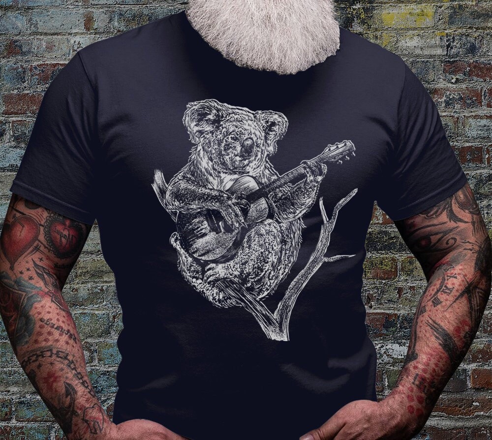Alter, dieses Shirt ist ja mal mega niedlich! Ein Koala mit Sonnenbrille der Gitarre spielt - was will man mehr? Das Design ist perfekt für alle Musik-Fans, Australien-Liebhaber oder einfach Leute die witzige Shirts mögen. Aus weichem Baumwollstoff gefertigt und doppelt genäht - hält also was aus! Ob für Konzerte, Musikfestivals oder einfach im Alltag - mit diesem Shirt fällst du garantiert auf. Der Koala sieht so entspannt aus mit seiner Gitarre, dass man gleich gute Laune kriegt. Super Geschenk für Musiklehrer, Band-Mitglieder oder den besten Freund der coole Shirts sammelt. Einfach was anderes als diese langweiligen Standard-Shirts! Und die Qualität stimmt auch - waschmaschinenfest und die Farben bleichen nicht so schnell aus. Trag's mit Jeans, Shorts oder Rock - sieht immer gut aus!