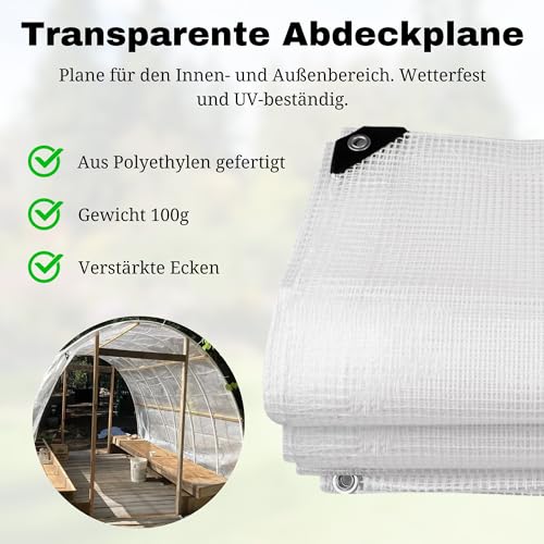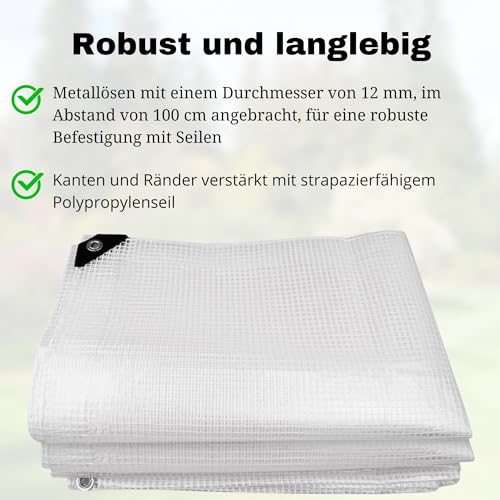 Dein zuverlässiger Schutz für draußen! Diese transparente Abdeckplane aus robustem Polyethylen-Gittergewebe hält dicht gegen Regen, Wind und UV-Strahlung. Mit den Maßen 1.2x1.4m perfekt für Gewächshäuser, Camping, Hühnerstall oder als Gartenschutz. Die eingearbeiteten Aluminiumösen alle 50cm machen die Befestigung super einfach - inklusive 5m Seil und 10 elastischen Bändern! Die Ecken sind extra verstärkt, damit nichts reißen kann. Transparent genug für gutes Pflanzenwachstum, aber stabil genug für widrigstes Wetter. Ob du deine Möbel schützen willst, die Ernte im Garten oder die Campingausrüstung - diese Plane macht einfach alles mit. Leicht zu falten und zu transportieren, aber unheimlich langlebig. Ein echter Alleskönner für jede Jahreszeit - von sommerlicher Hitze bis winterlichem Frost!