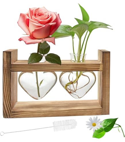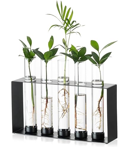 Grüner Daumen mal anders! In dieser hübschen Anzuchtstation aus Glas siehst du deine Stecklinge beim Wurzeln zu - total spannend! Der schwarze Metallständer mit Holzbrett und 5 Glasvasen sieht schick aus und passt super auf den Schreibtisch, Fensterbank oder Regal. Alles schon montiert, einfach die Pflanzen rein und los geht's. Perfekt für Pflanzenfans, als Deko oder Geschenk zur Einweihungsparty. Übrigens: Die Vasen sind handgeblasen und farbenfroh. Und falls mal was kaputt geht, melde dich einfach bei uns!