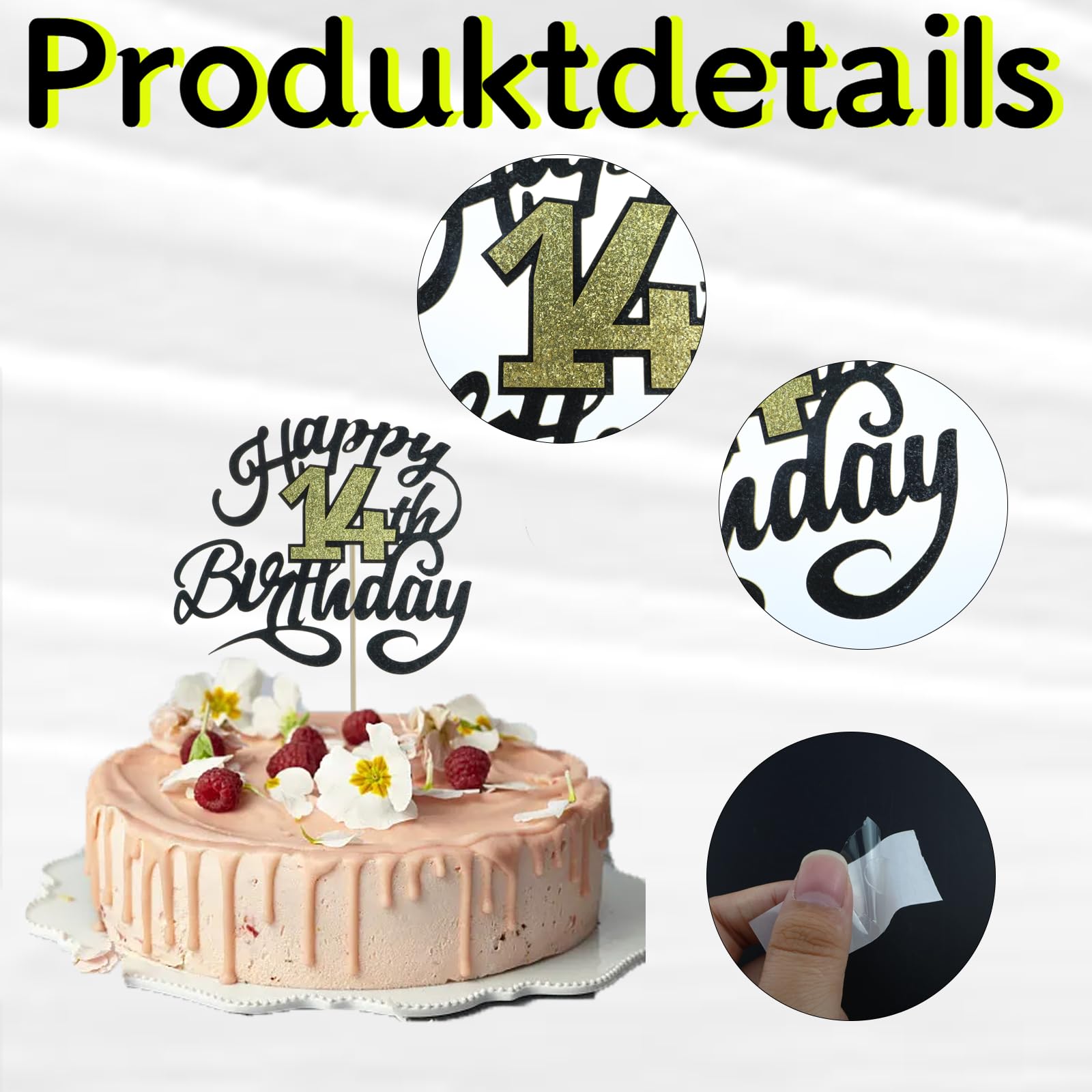 Mach den 14. Geburtstag unvergesslich! Dieser wunderschöne Cake Topper in Schwarz-Gold mit Glitzer-Effekt verwandelt jeden Kuchen in ein Kunstwerk. Aus stabilem Glitzerkarton, 16 cm breit. Perfekt für Geburtstagstorten, Cupcakes oder als Deko für Desserts. Einfach in den Kuchen stecken - fertig ist die festliche Dekoration! Achtung: Nicht essbar und nicht für Mikrowelle oder Backofen geeignet. Wird sicher in stabiler Pappe verpackt geliefert. Das ideale Geschenk für alle, die eine besondere Geburtstagsfeier planen!