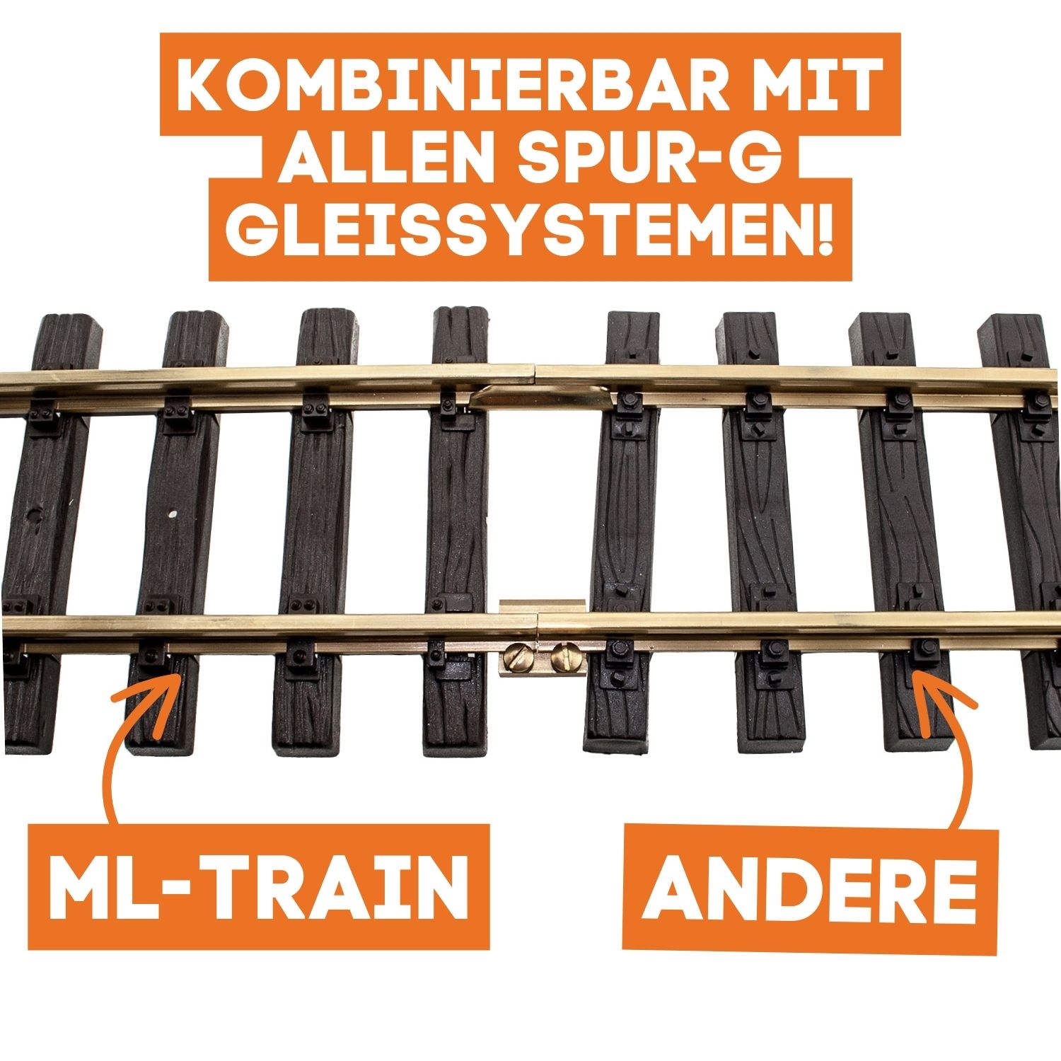 Alter, das ist ja echtes Profi-Zubehör für deine Modellbahn! Dieses ML-Train Messing-Gleis ist 30 cm lang und komplett kompatibel mit allen Spur G Systemen! Aus massivem Messing gefertigt - super langlebig und stabil! Mit robusten Schraubschienenverbindern - die sorgen für perfekte elektrische und mechanische Verbindungen! Das Gleisbett aus HDPE-Kunststoff in Holzoptik sieht total authentisch aus! Die Schwellen sind gleichmäßig angeordnet - auch an den Verbindungsstellen! Einfach zu kürzen - passt sich perfekt deiner Anlage an! Die Schienenverbinder haben Schwalbenschwanzführung - einfach von oben montieren, ohne Gleise auseinanderziehen zu müssen! Mit Lötösen für einfachen Kabelanschluss! Viel günstiger als andere Marken, aber ohne Qualitätsverzicht! Perfekt für stabile, zuverlässige Gleisanlagen ohne Wackelkontakte! So macht Modellbahnfahren richtig Spaß - ohne ständige Stromunterbrechungen! Einfach ein Traum für jeden Gartenbahn-Fan!