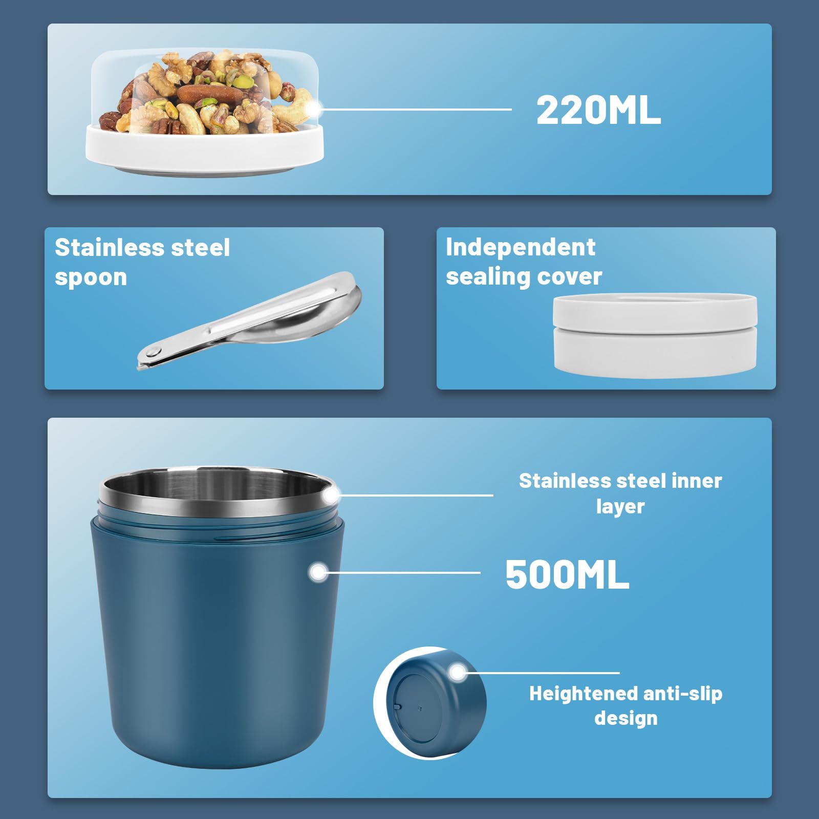 Morgens immer hetzen? Mit diesem Müslibecher bereitest du dein Frühstück im Voraus zu und nimmst es einfach mit. Der Becher hat zwei Fächer: Ein 530 ml Edelstahlgefäß für Joghurt oder Milch und einen 330 ml BPA-freien Becher für Müsli oder Haferflocken. Das Twist-Lock-System verbindet beide Teile sicher - nichts läuft aus! Der integrierte Klapplöffel ist immer griffbereit und platzsparend untergebracht. Einfach den Deckel öffnen und loslegen - ob im Büro, in der Schule oder unterwegs. Die Deckel schließen absolut dicht - da passiert nichts in deiner Tasche. Alles ist spülmaschinenfest und geruchsneutral - also super einfach zu reinigen. Der Edelstahlteil ist sogar gefrierfest - du kannst also alles vorbereiten und über Nacht im Kühlschrank lassen. Das schlichte Design ohne Aufdrucke lässt sich super individualisieren - vielleicht mit einem coolen Sticker? Egal ob du Overnight Oats, Cerealien oder einfach nur Joghurt mit Früchten magst - hier ist alles möglich. Mach dir das Leben leichter und starte entspannt in den Tag - mit einem leckeren Frühstück, wann und wo du willst!