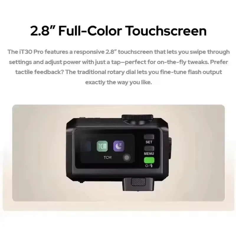 Brauchst du einen kompakten, aber leistungsstarken Blitz für deine Sony-Kamera? Der Godox iT30Pro ist genau das, was du suchst! Super klein und leicht (nur 120g), passt er in jede Fototasche und ist damit perfekt für unterwegs. Mit TTL-Autobelichtung und HSS bis 1/8000s hast du immer die richtige Belichtung - egal bei welchem Licht. Der 7,1cm Touchscreen macht die Bedienung super einfach. Du kannst zwischen M-Modus, TTL und Multi-Modus wählen und alles ganz einfach per Wischgeste einstellen. Der Blitz funktiert auch als Sender oder Empfänger im Godox 2,4G Wireless System - ideal wenn du mehrere Blitze gleichzeitig verwenden willst. Kompatibel mit allen gängigen Sony-Modellen wie α7, α9, α6000-Serie und vielen mehr. Mit Lithium-Akku betrieben und immer einsatzbereit. So machst du auch bei schwierigen Lichtverhältnissen noch bessere Fotos!